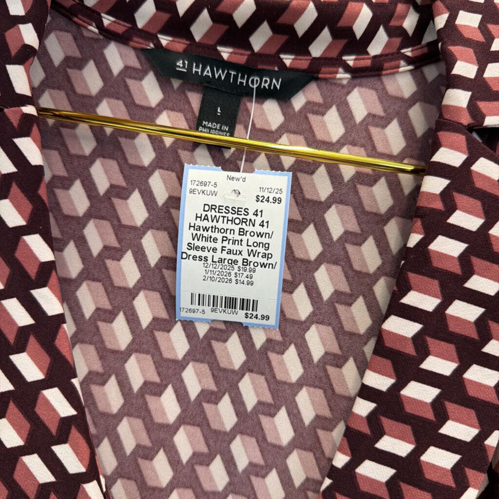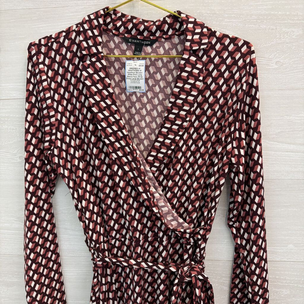 41 Hawthorn Brown/ White Print Long Sleeve Faux Wrap Dress Large
