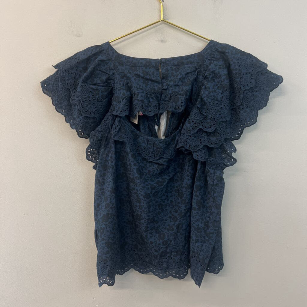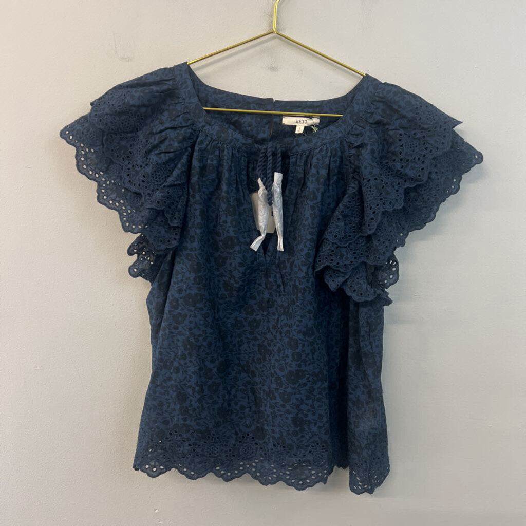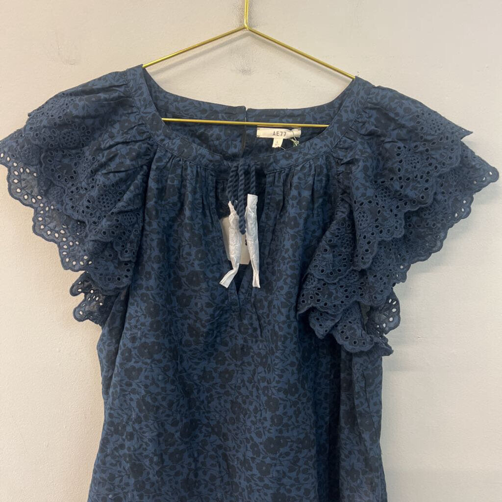 AE77 Navy Print Short Ruffle Sleeve Top Large