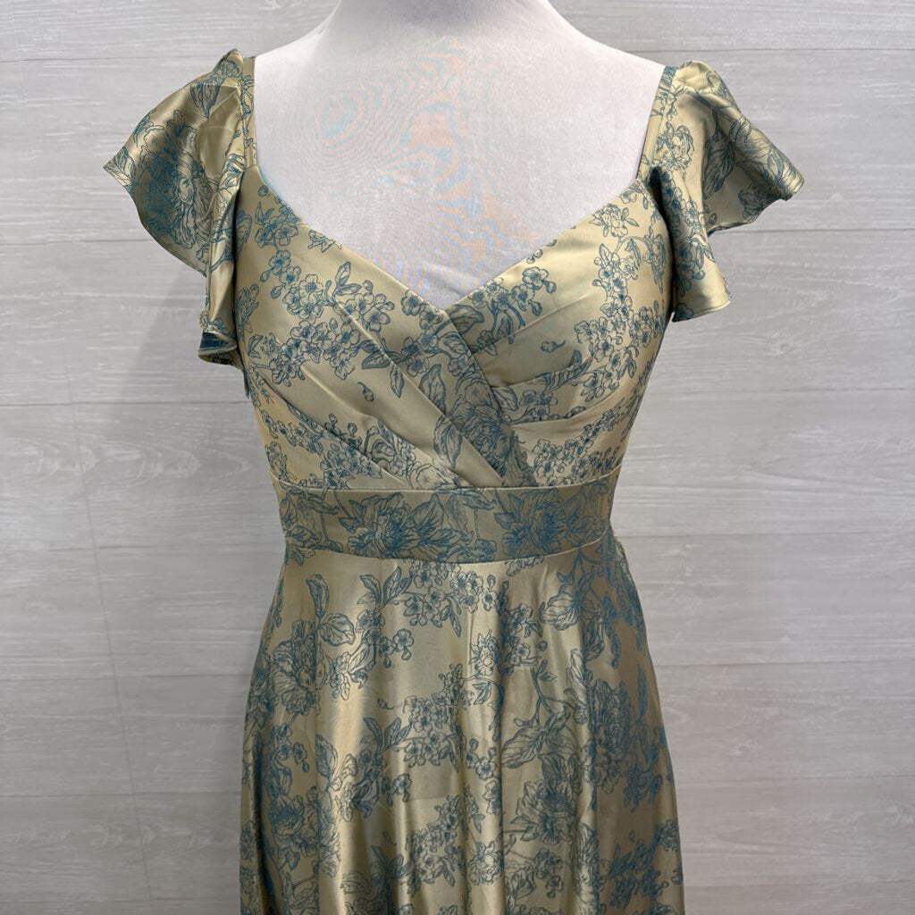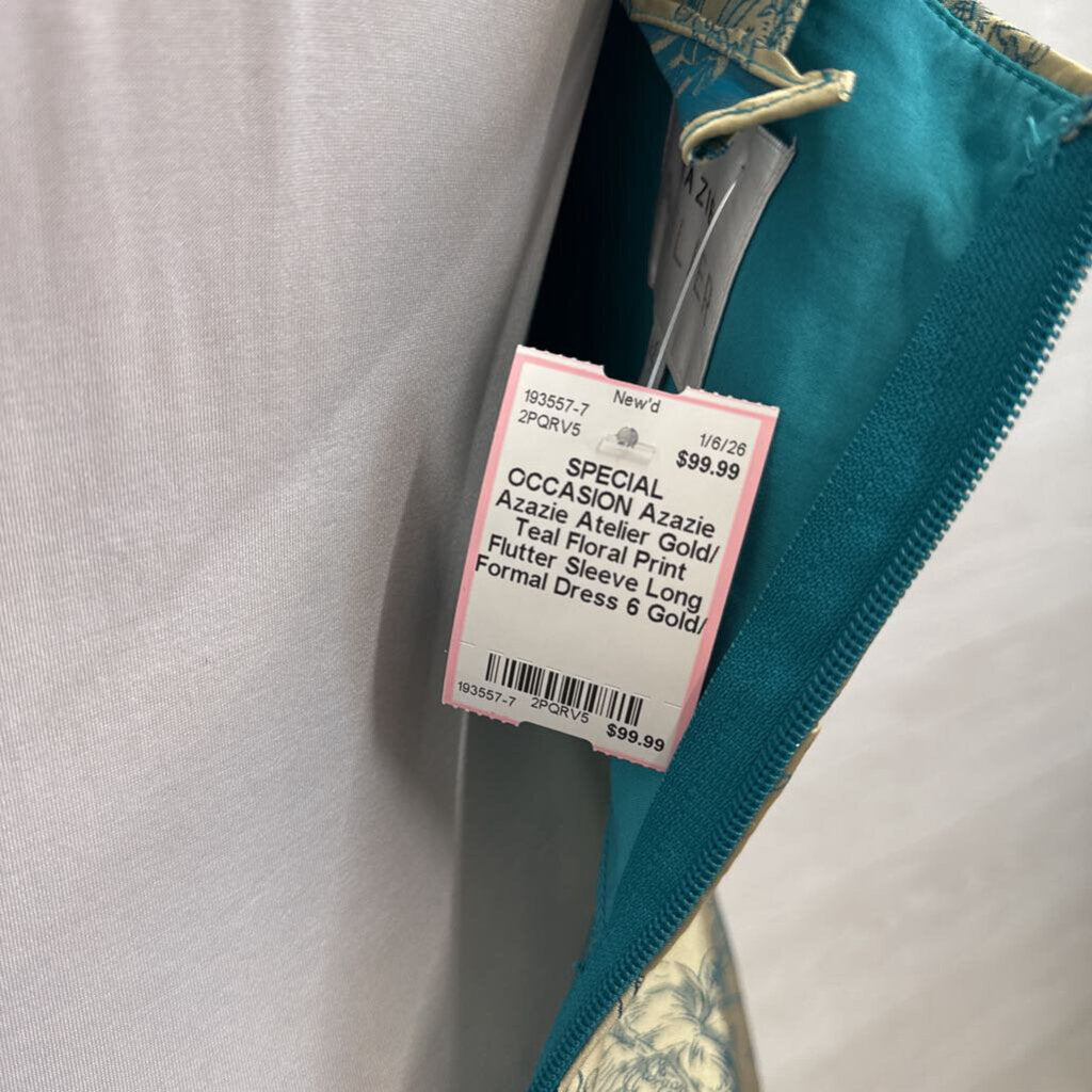Azazie Atelier Gold/ Teal Floral Print Flutter Sleeve Long Formal Dress 6