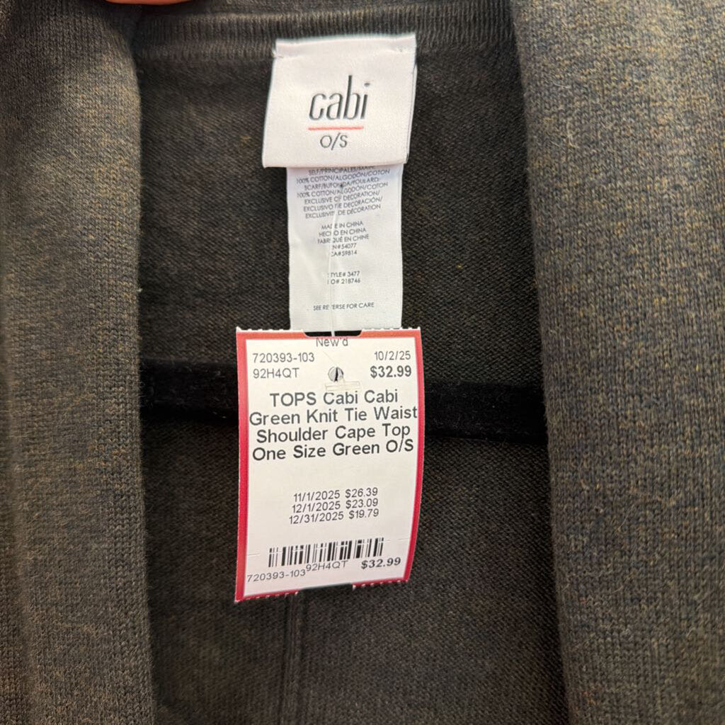 Cabi Green Knit Tie Waist Shoulder Cape Top One Size