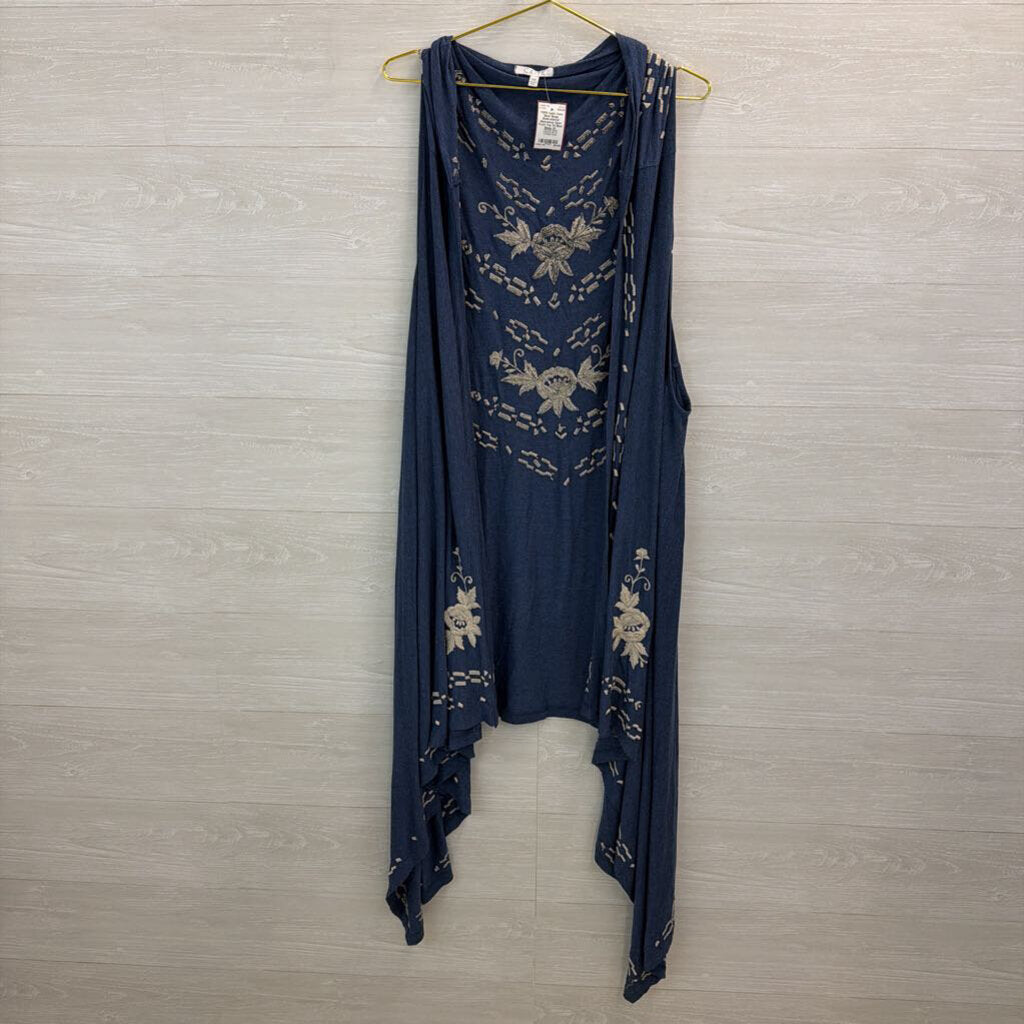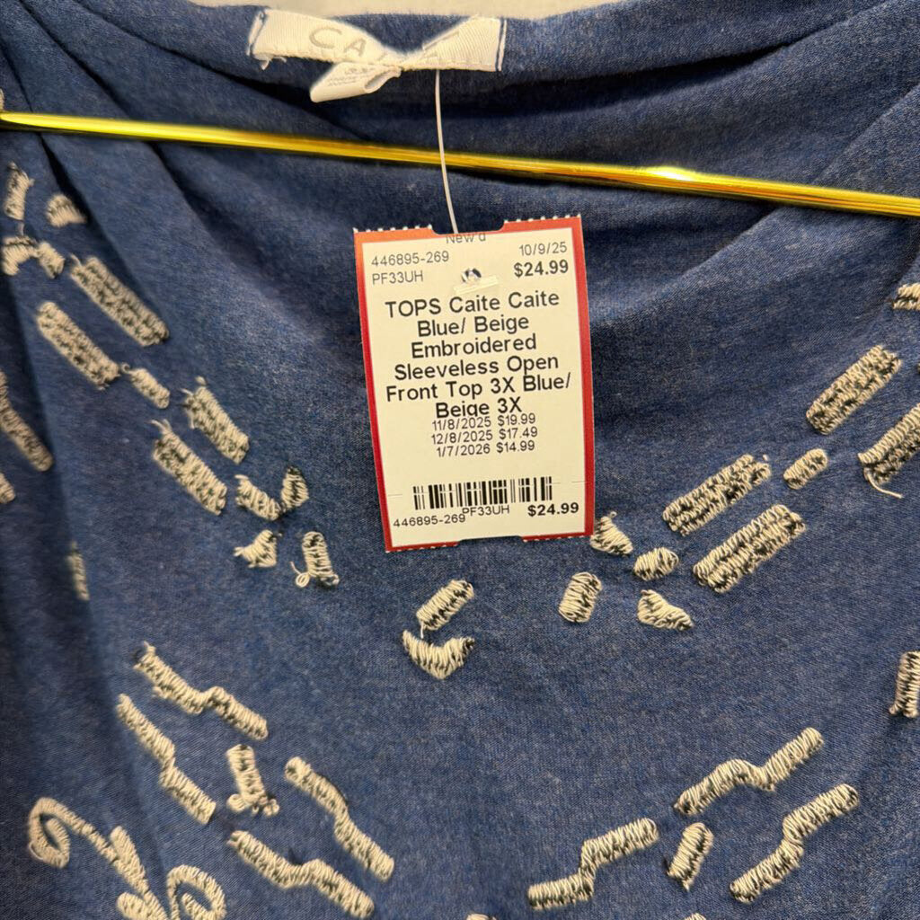 Caite Blue/ Beige Embroidered Sleeveless Open Front Top 3X