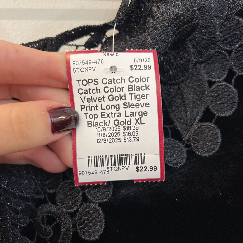 Catch Color Black Velvet Gold Tiger Print Long Sleeve Top Extra Large