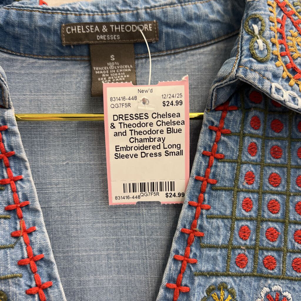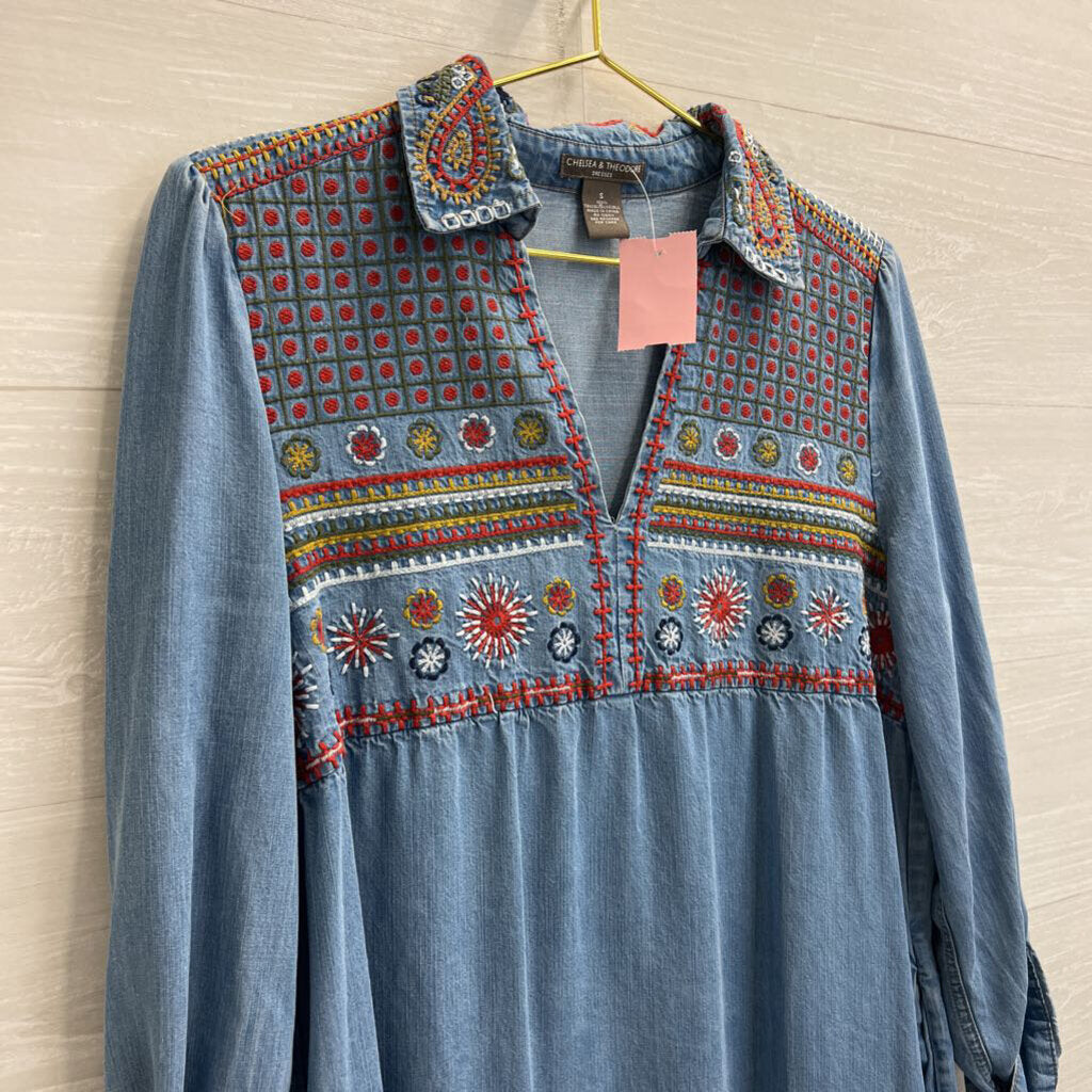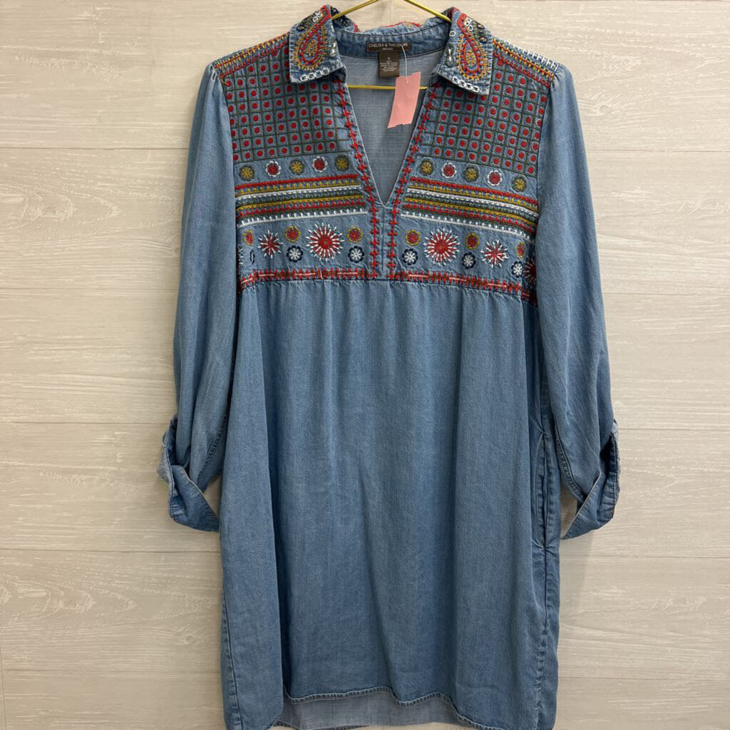 Chelsea and Theodore Blue Chambray Embroidered Long Sleeve Dress Small
