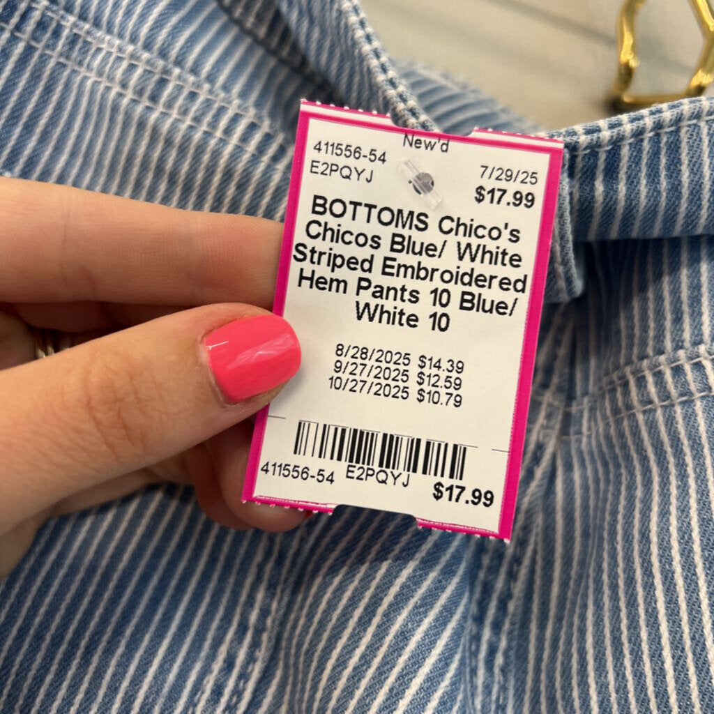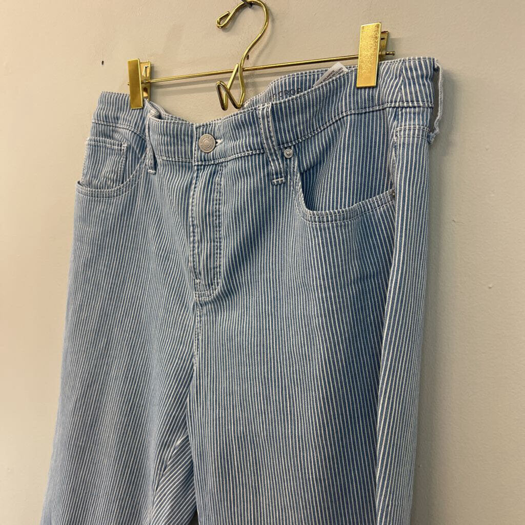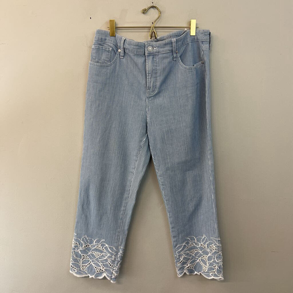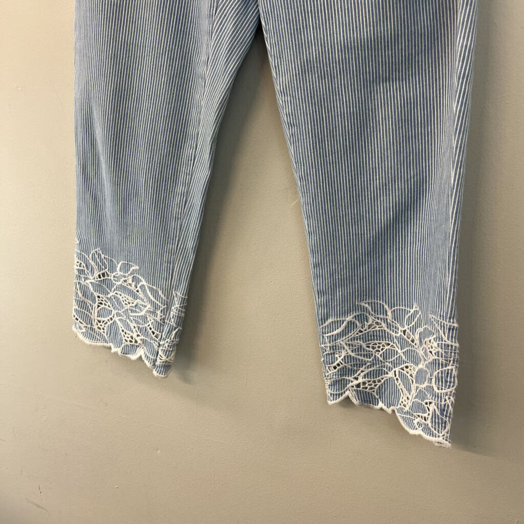 Chicos Blue/ White Striped Embroidered Hem Pants 10