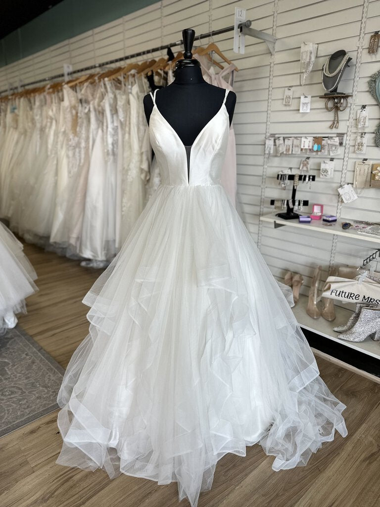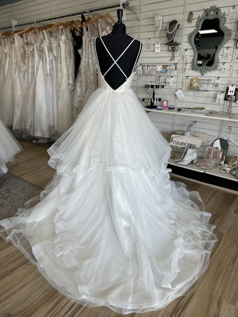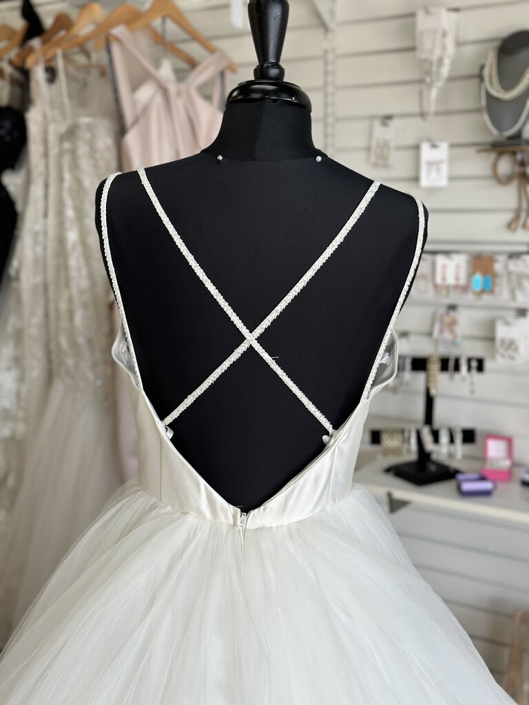 Christina Wu Ivory Mikado Deep V- Neck Tulle Horsehair Hem Skirt 10