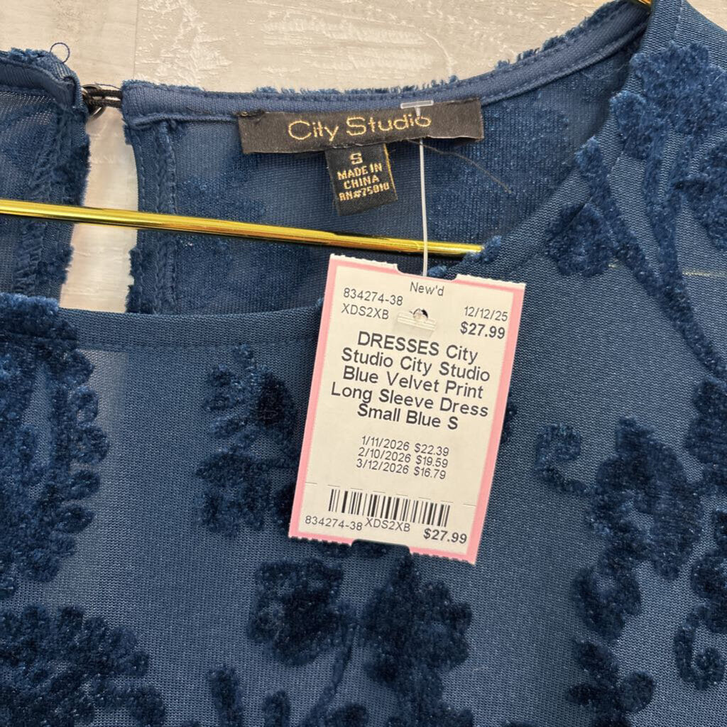 City Studio Blue Velvet Print Long Sleeve Dress Small