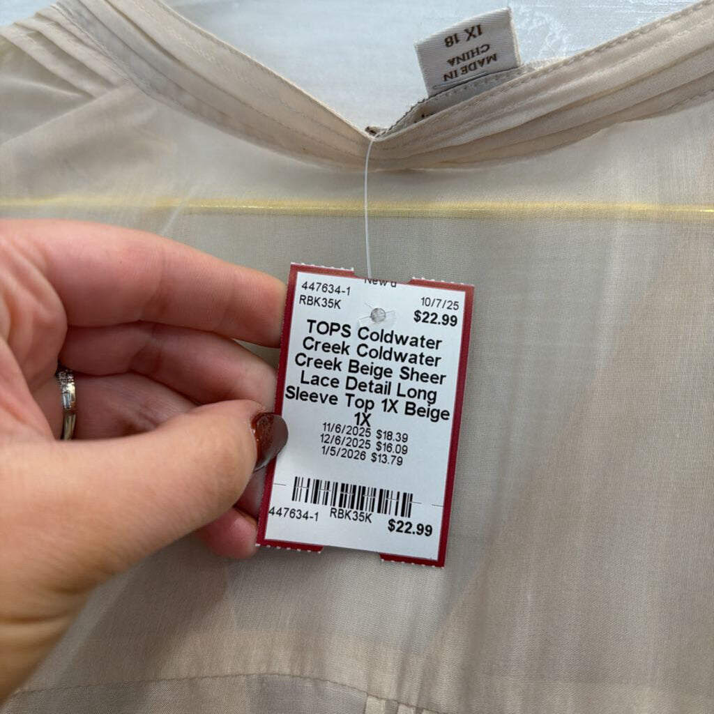 Coldwater Creek Beige Sheer Lace Detail Long Sleeve Top 1X