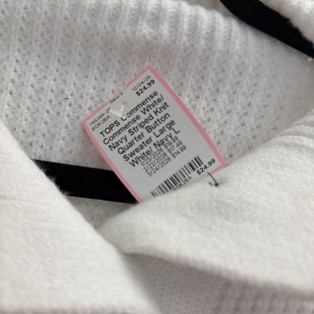 Commense White/ Navy Striped Knit Quarter Button Sweater Large