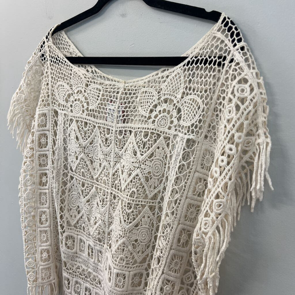 Cream Crochet Knit Short Sleeve Fringe Hem Top Medium