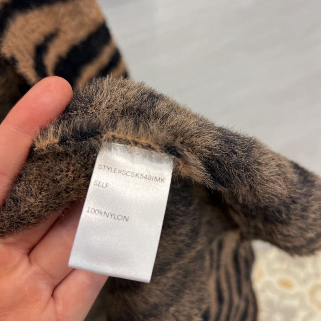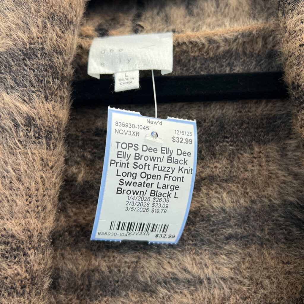 Dee Elly Brown/ Black Print Soft Fuzzy Knit Long Open Front Sweater Large