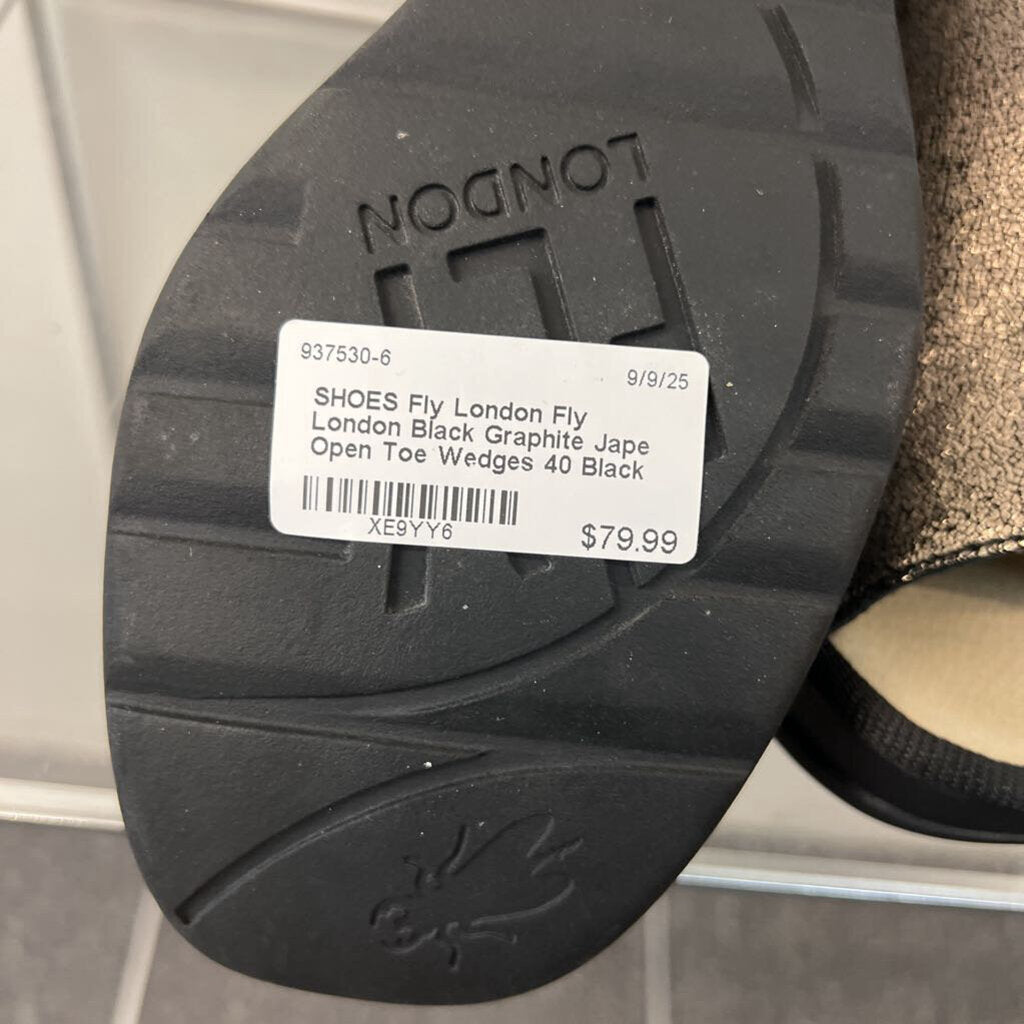 Fly London Black Graphite Jape Open Toe Wedges 40