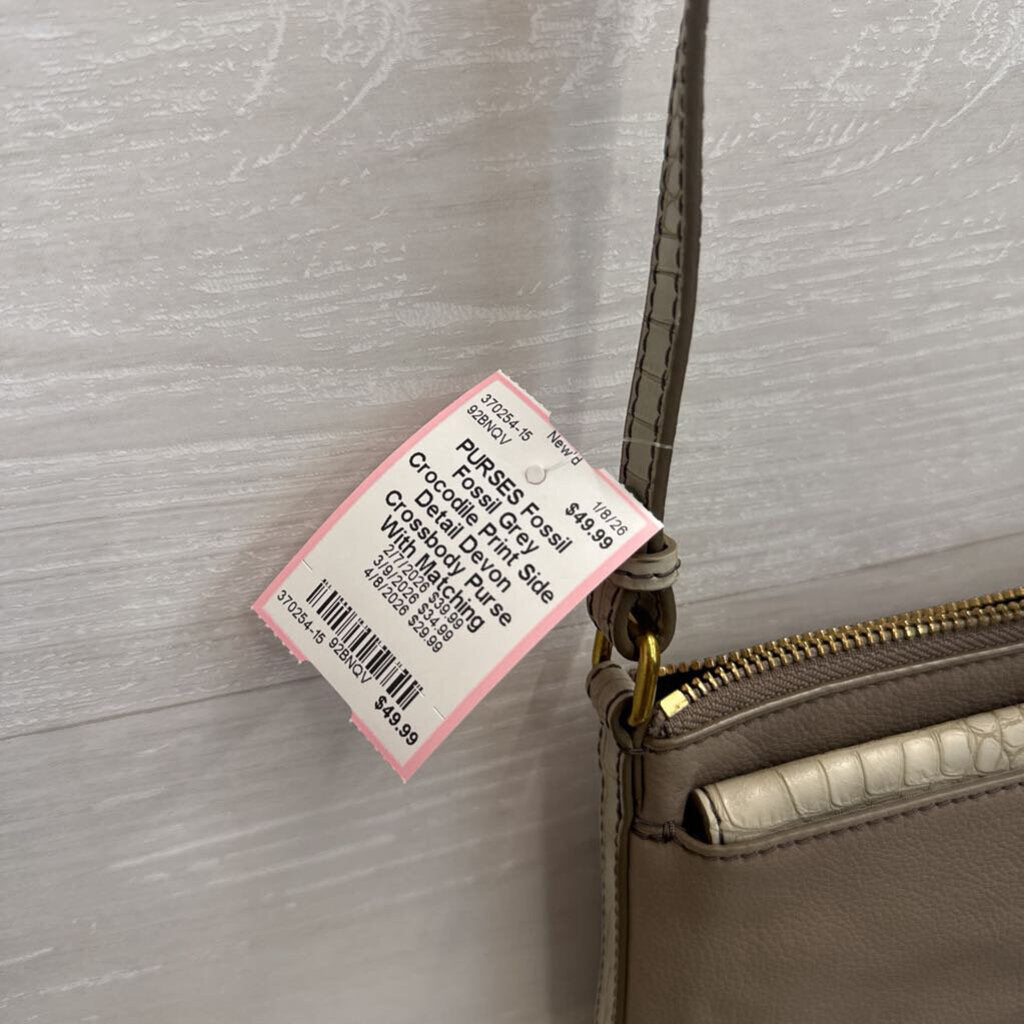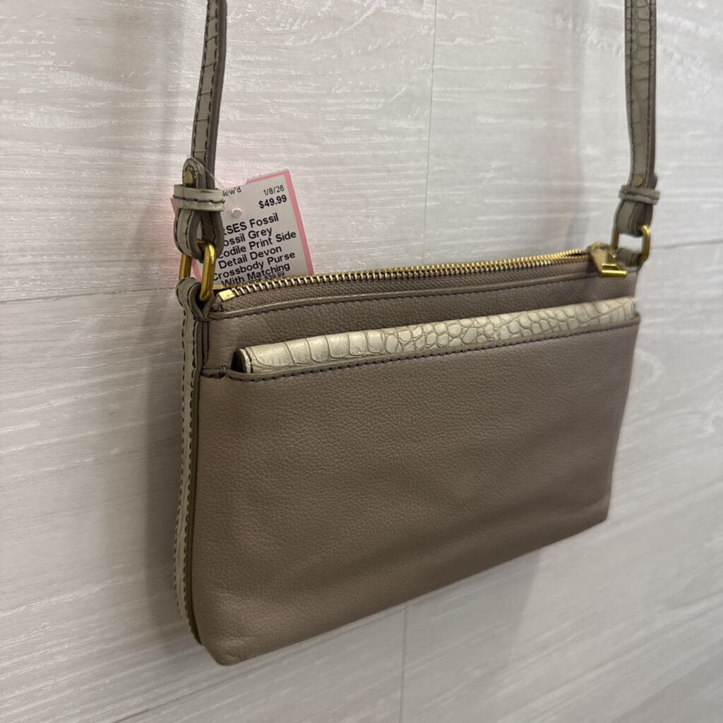 Fossil Grey Crocodile Print Side Detail Devon Crossbody Purse With Matching Wallet