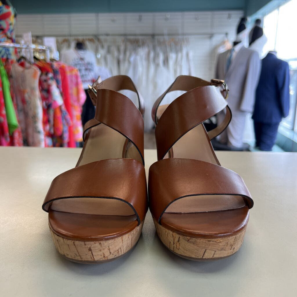 Franco Sarto Brown Leather Strap Cork Wedge Heels 9