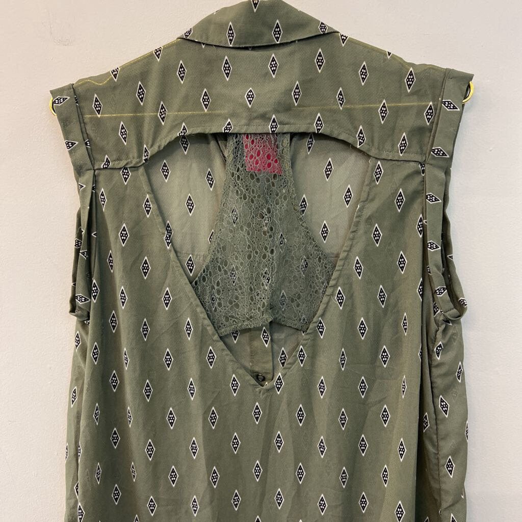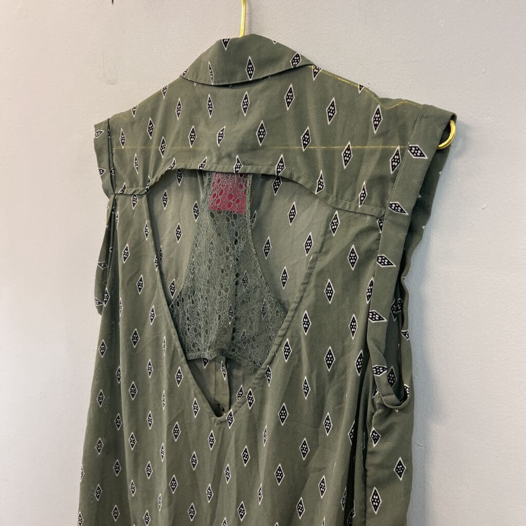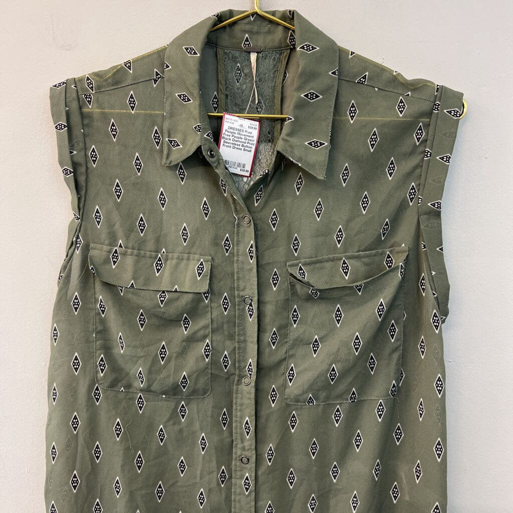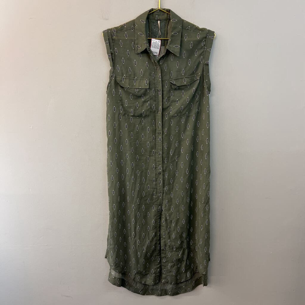 Free People Green/ Black Diamond Print Sleeveless Button Front Dress Small