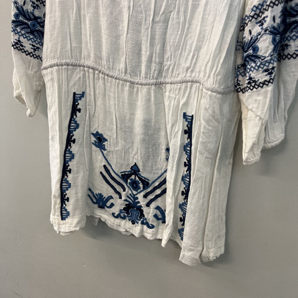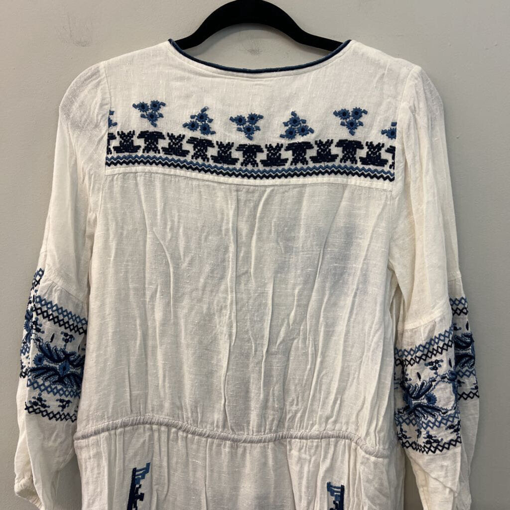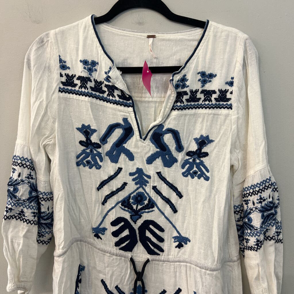 Free People White/ Blue Embroidered Long Sleeve Tunic Top Small