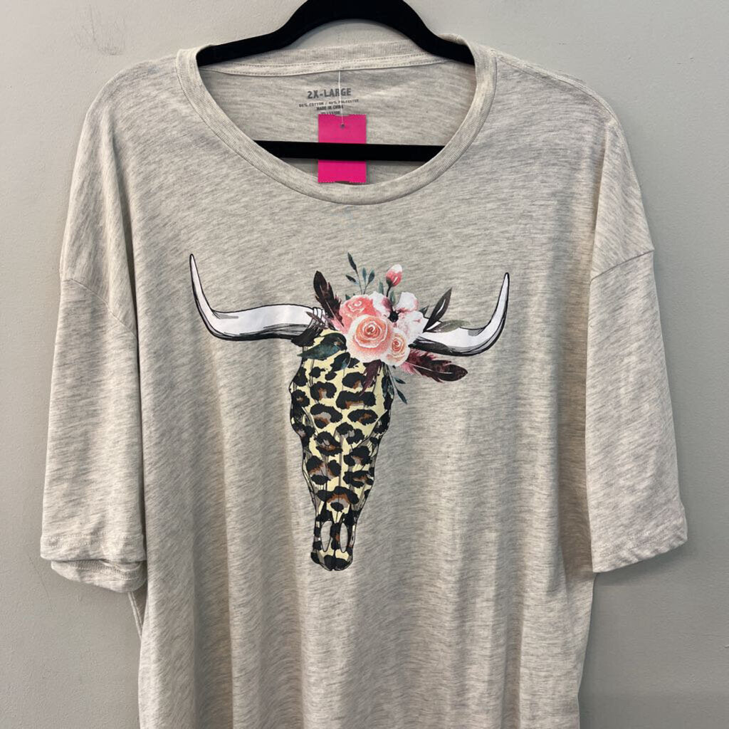 Grey/ Multi Leopard Cow Skull With Antlers Short Sleeve Graphic Tee 2X