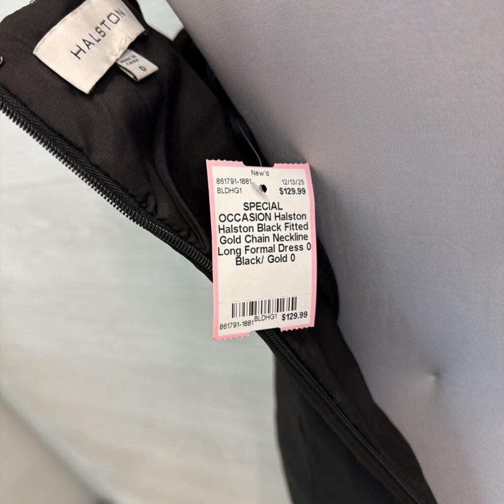 Halston Black Fitted Gold Chain Neckline Long Formal Dress 0