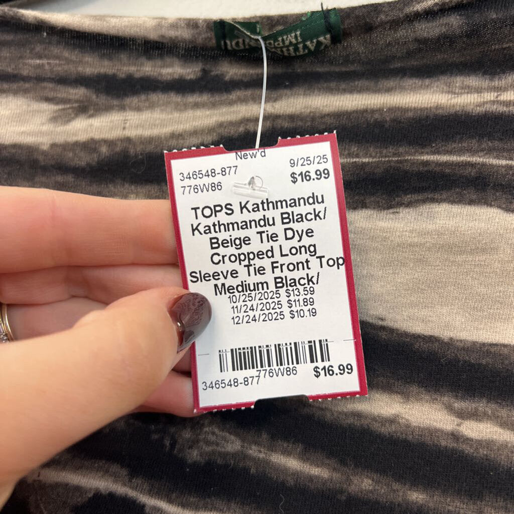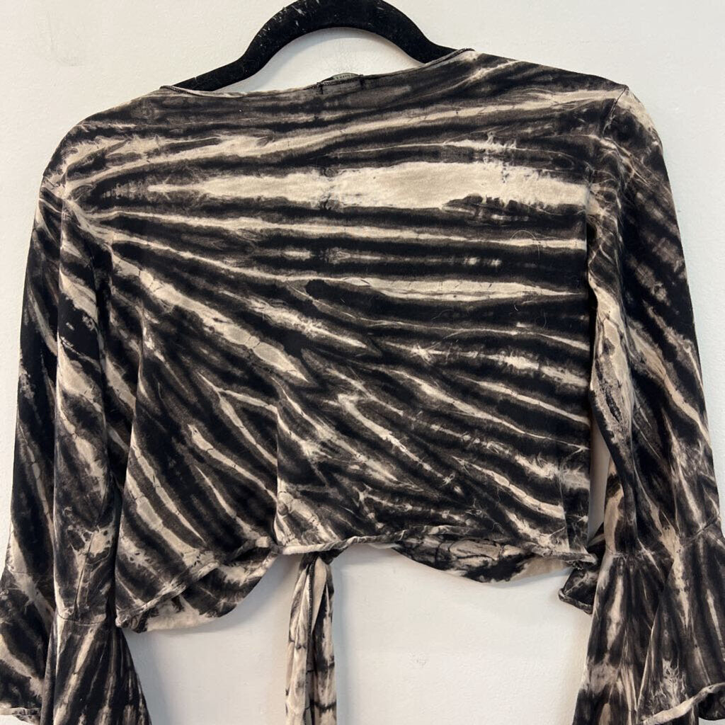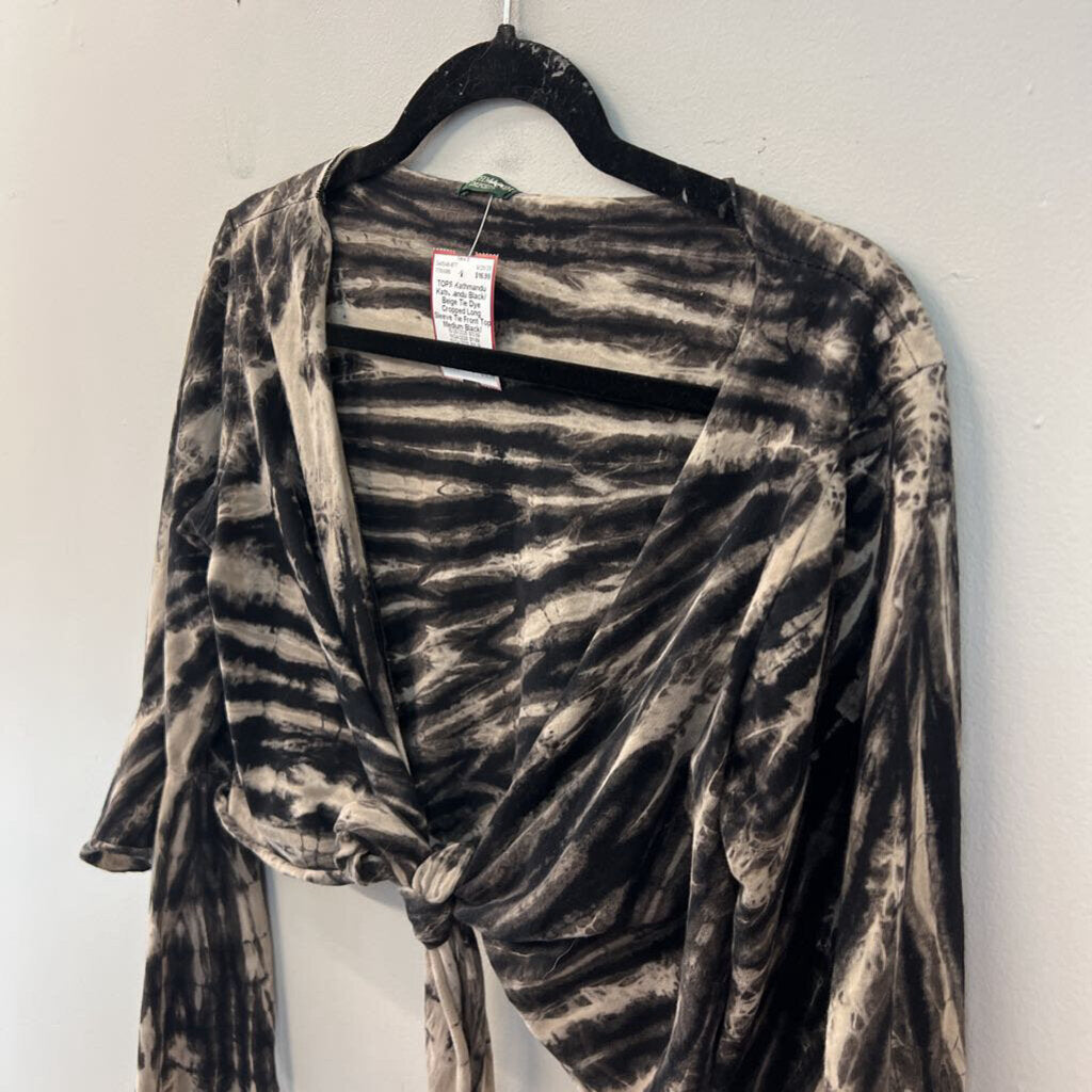 Kathmandu Black/ Beige Tie Dye Cropped Long Sleeve Tie Front Top Medium
