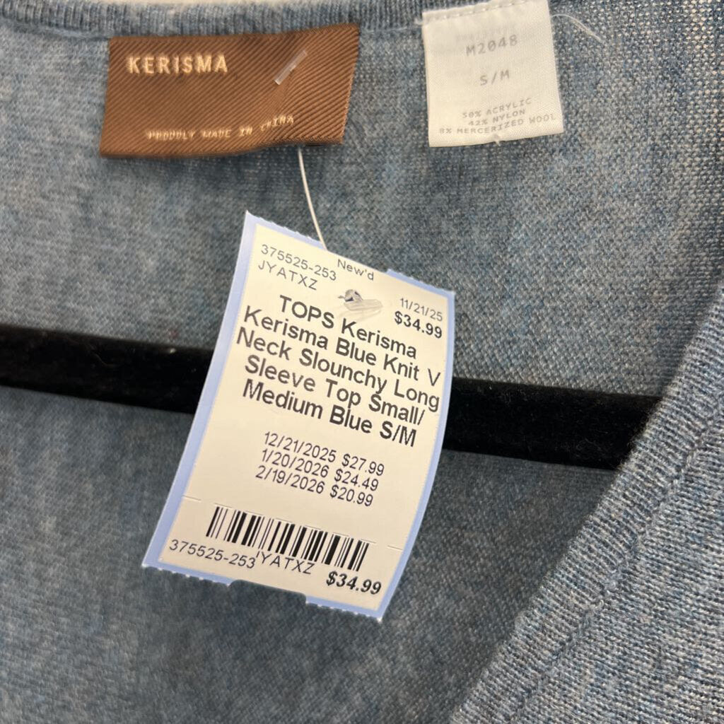 Kerisma Blue Knit V Neck Slounchy Long Sleeve Top Small/ Medium