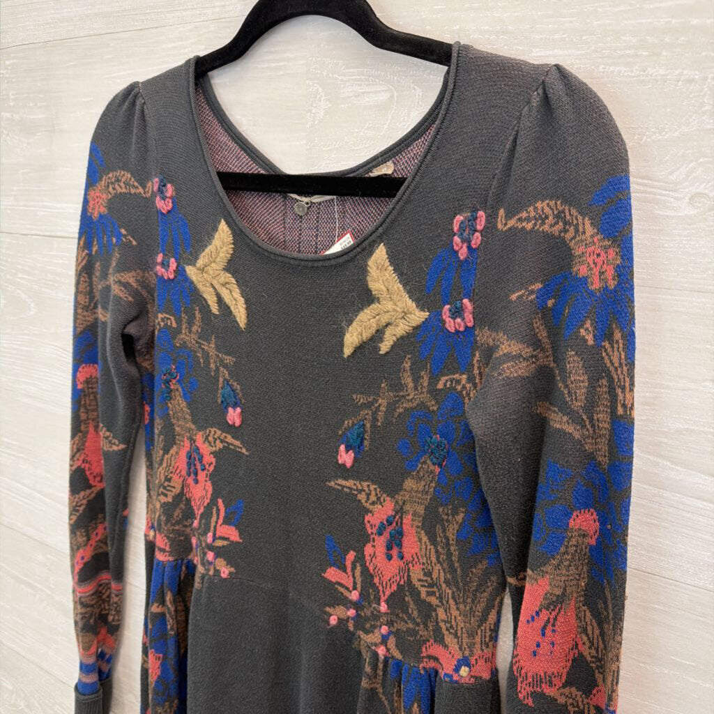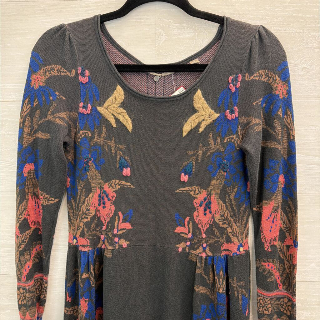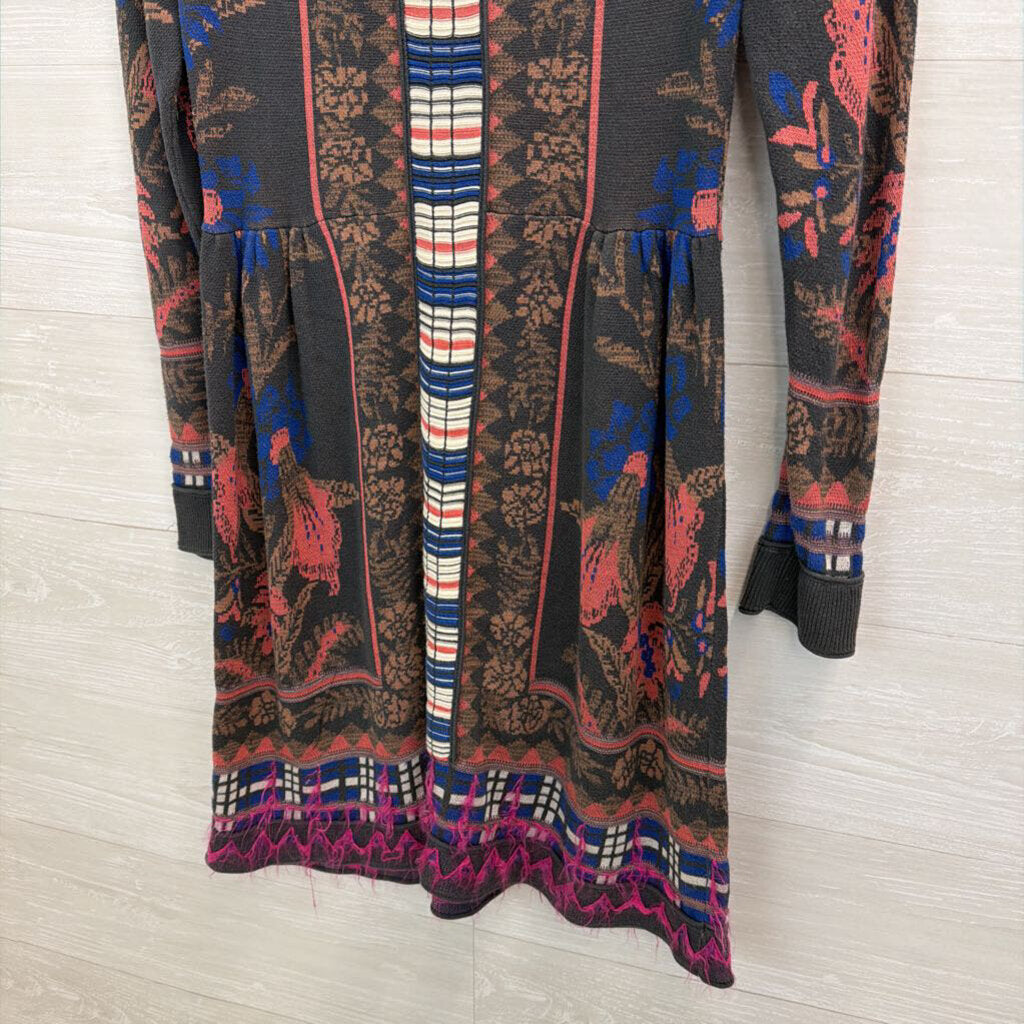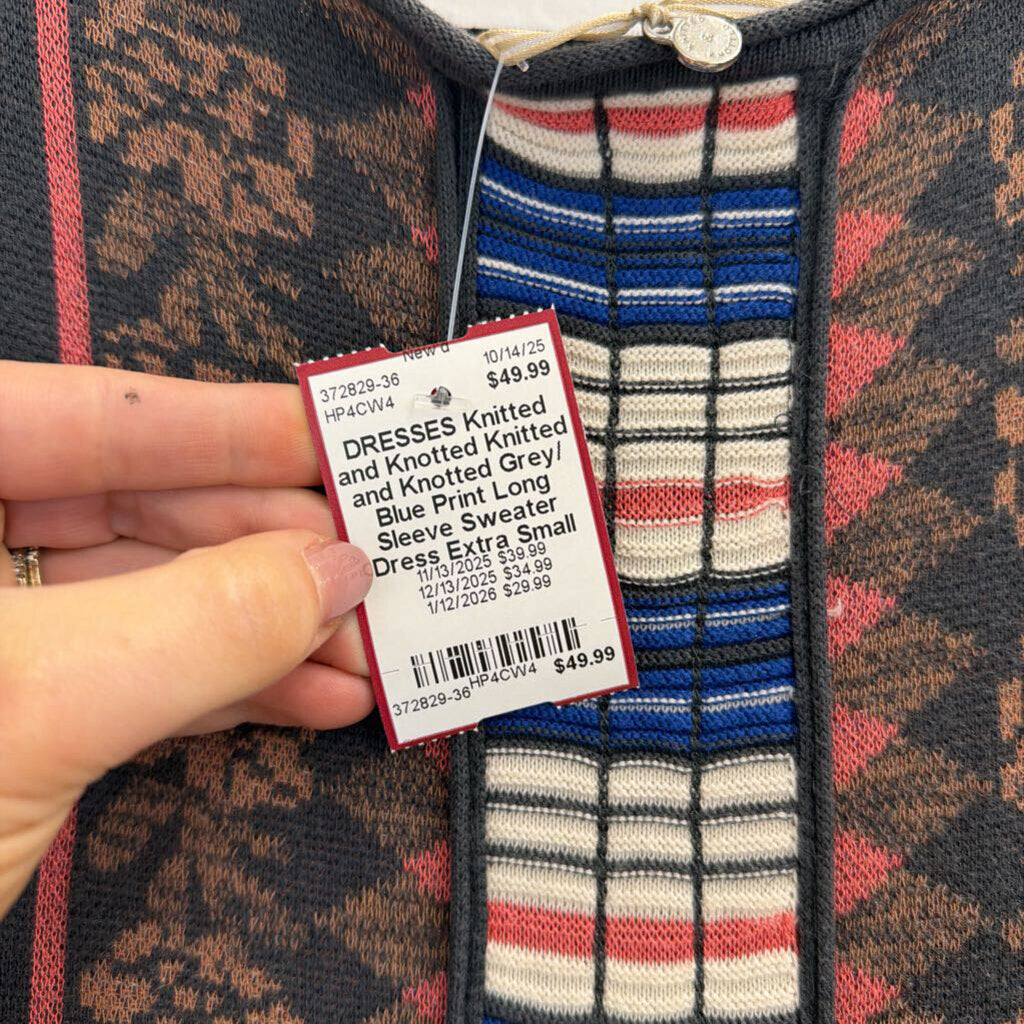 Knitted and Knotted Grey/ Blue Print Long Sleeve Sweater Dress Extra Small