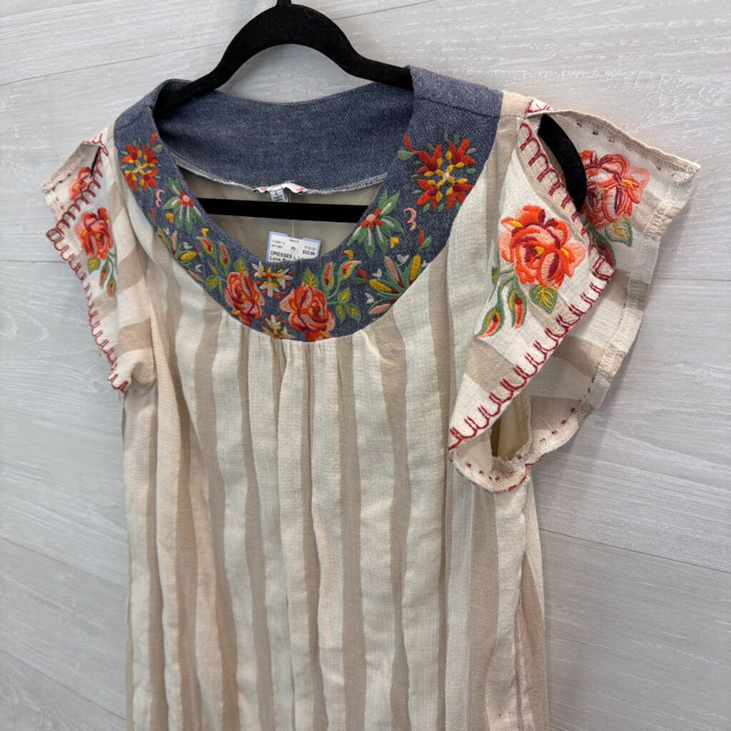 L Love Beige/ Cream Striped Embroidered Short Sleeve Dress Large