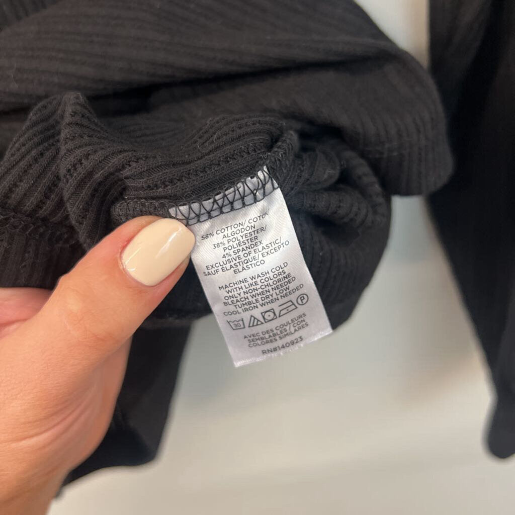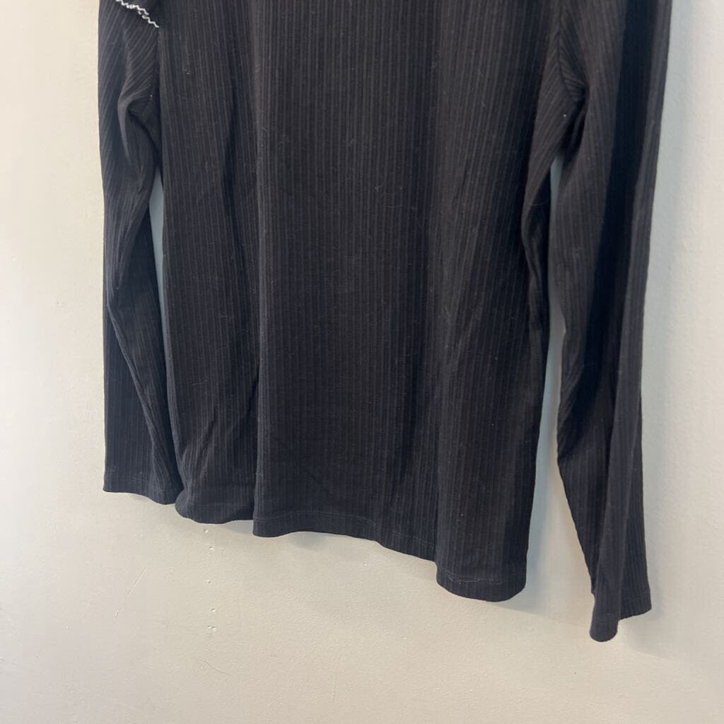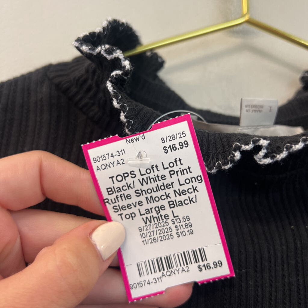 Loft Black/ White Print Ruffle Shoulder Long Sleeve Mock Neck Top Large