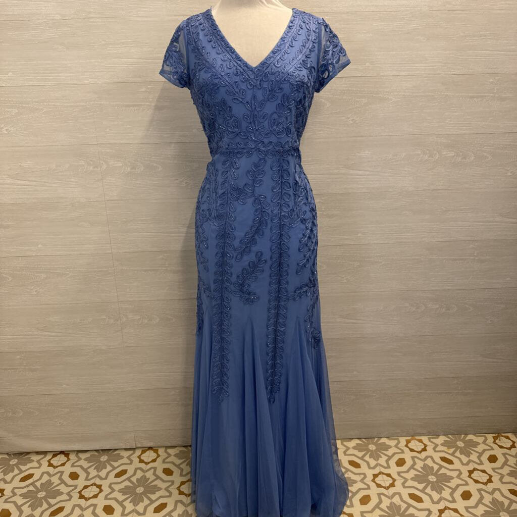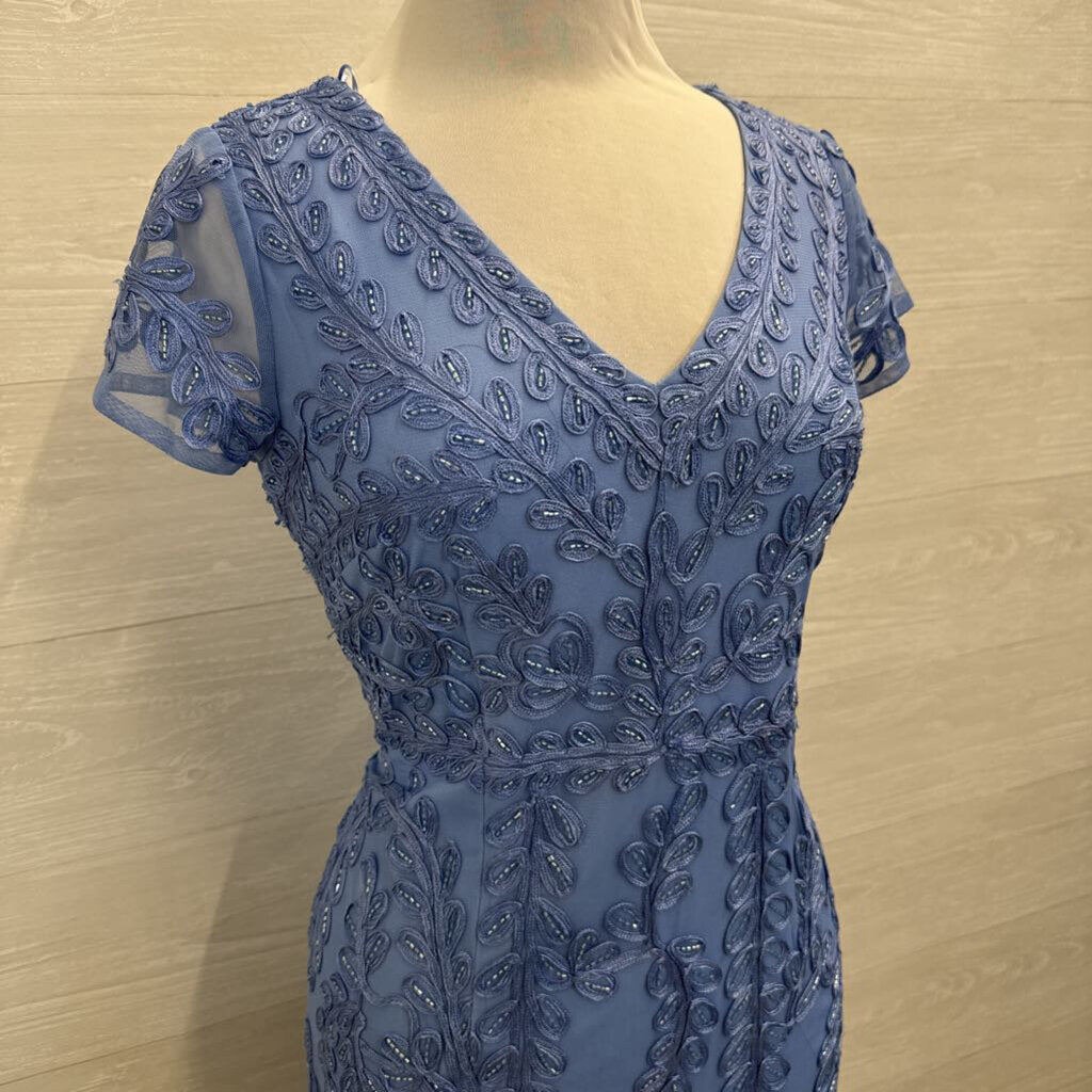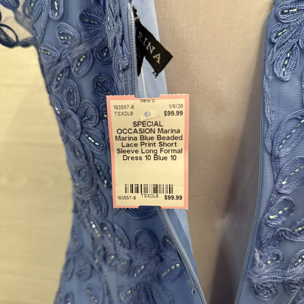 Marina Blue Beaded Lace Print Short Sleeve Long Formal Dress 10