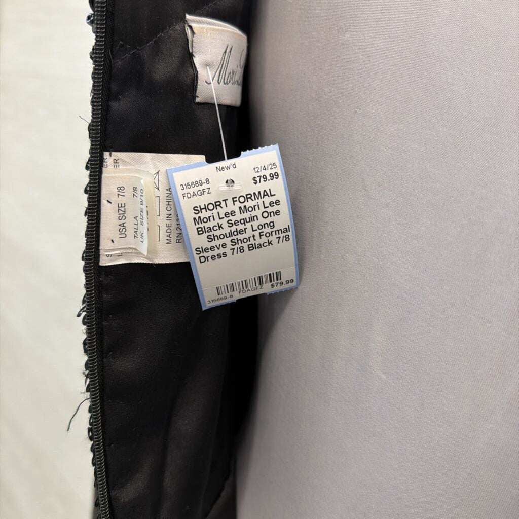 Mori Lee Black Sequin One Shoulder Long Sleeve Short Formal Dress 7/8