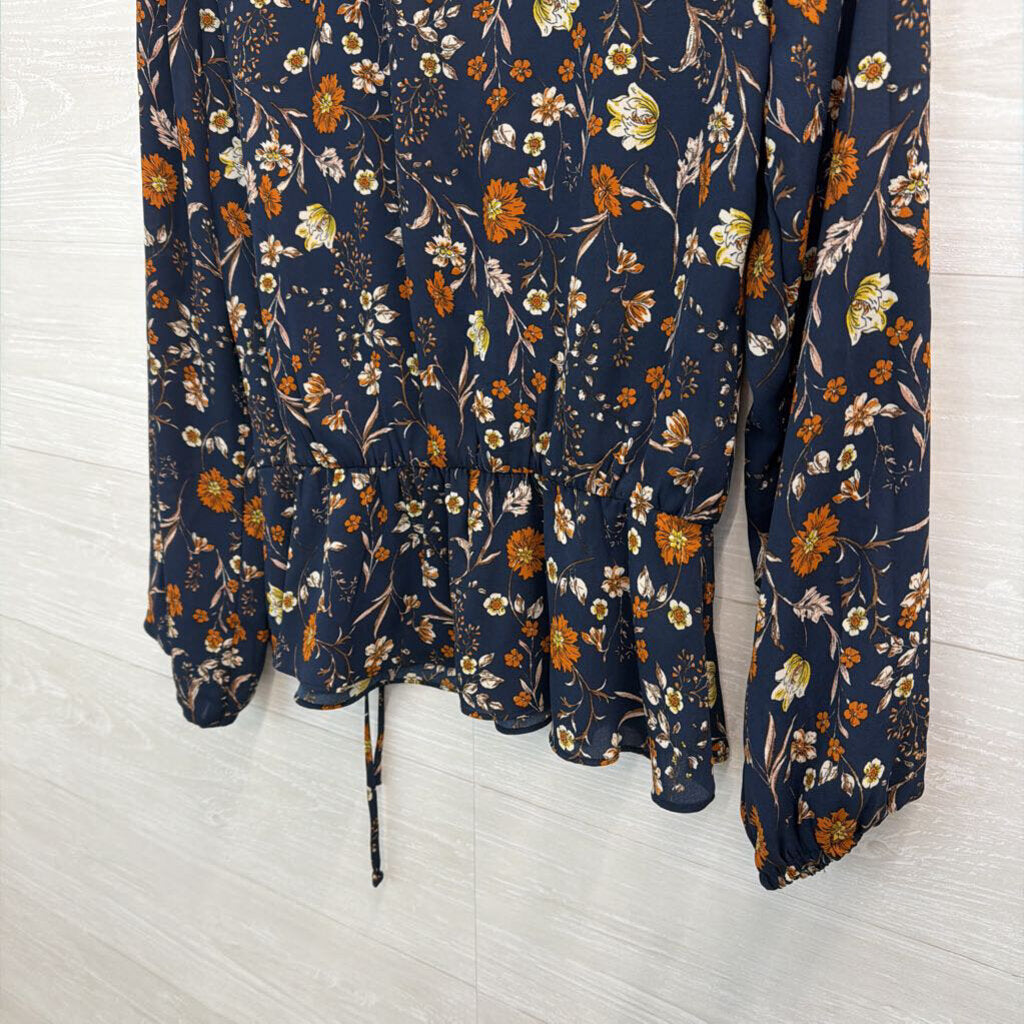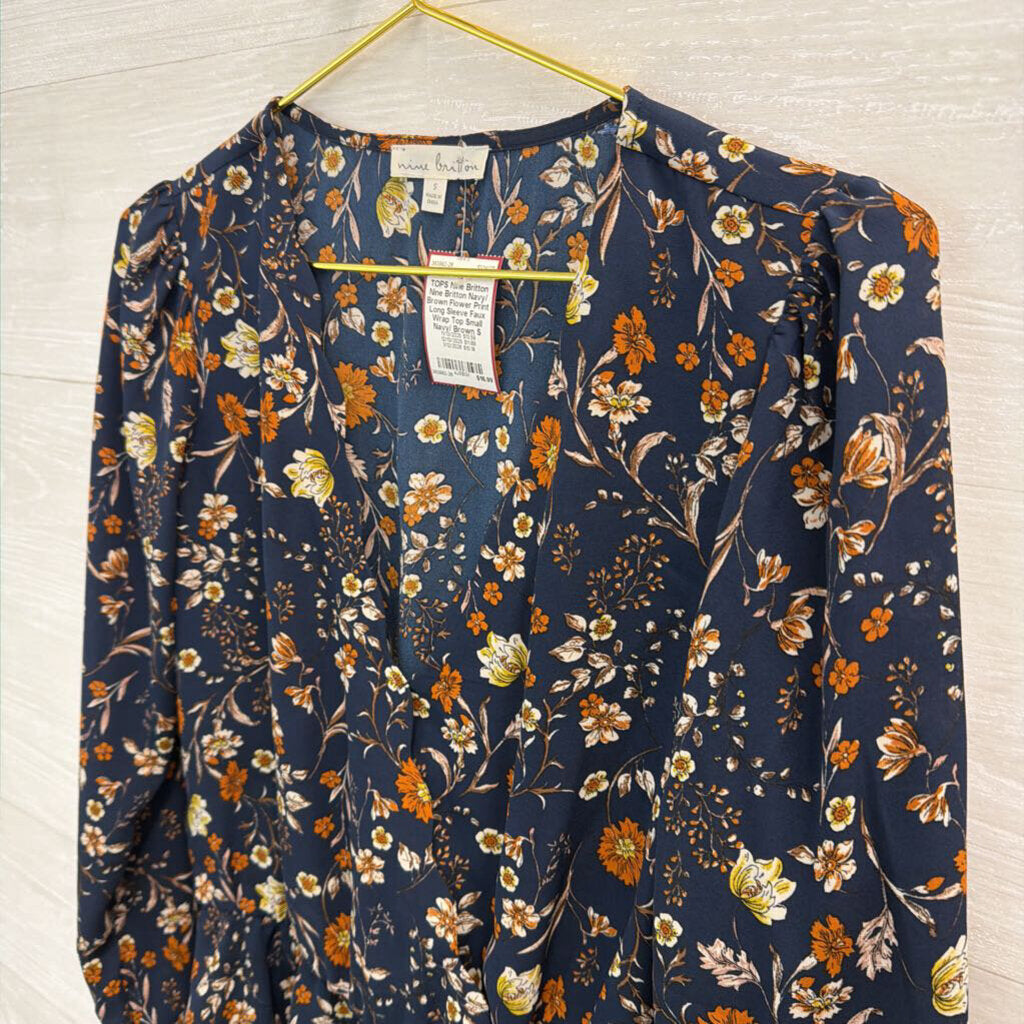 Nine Britton Navy/ Brown Flower Print Long Sleeve Faux Wrap Top Small