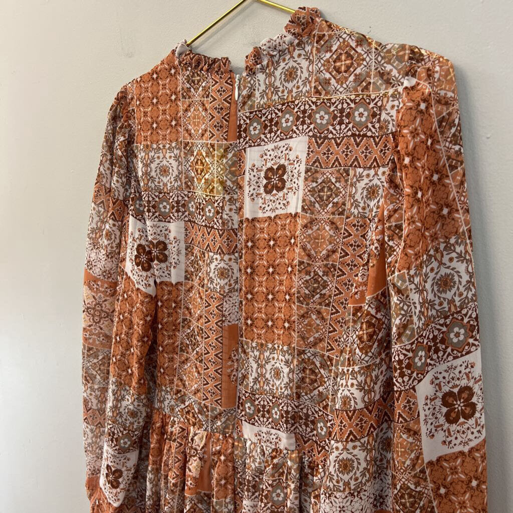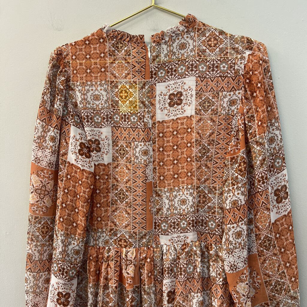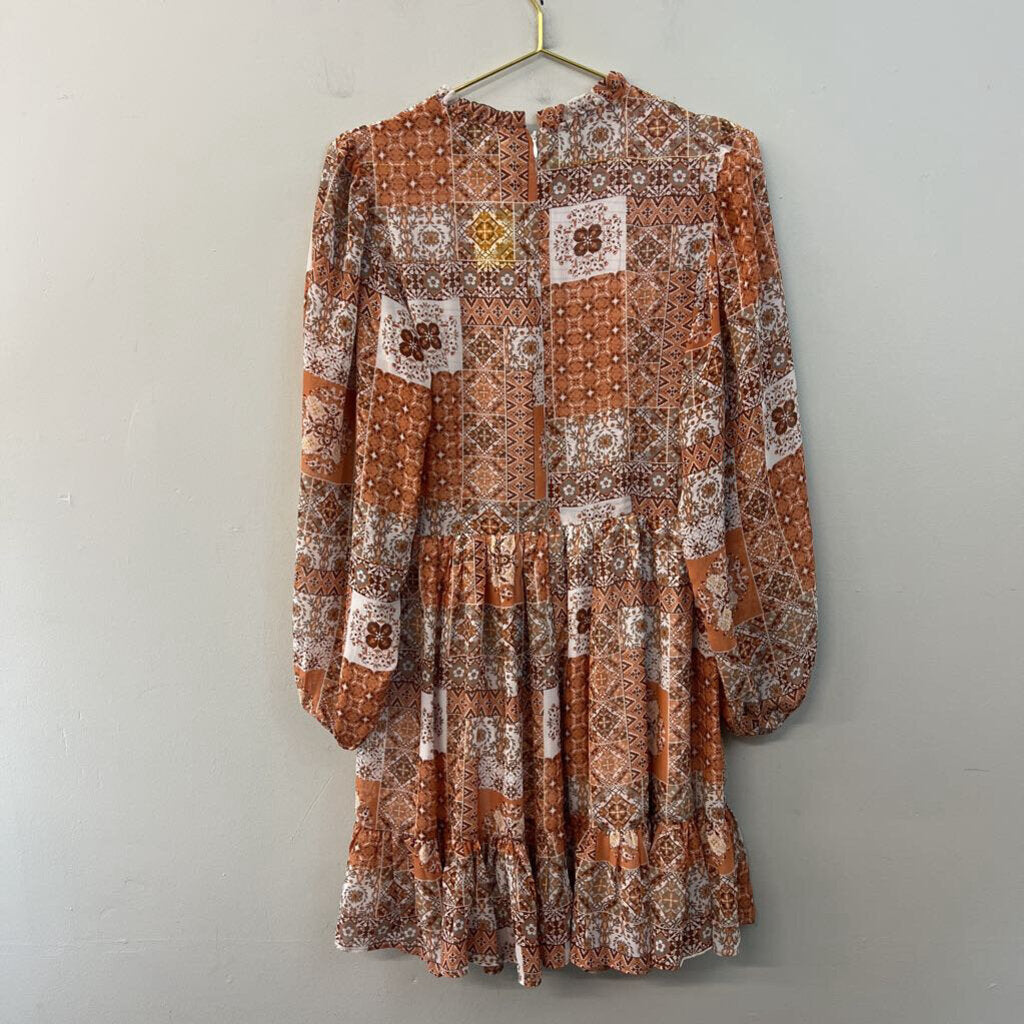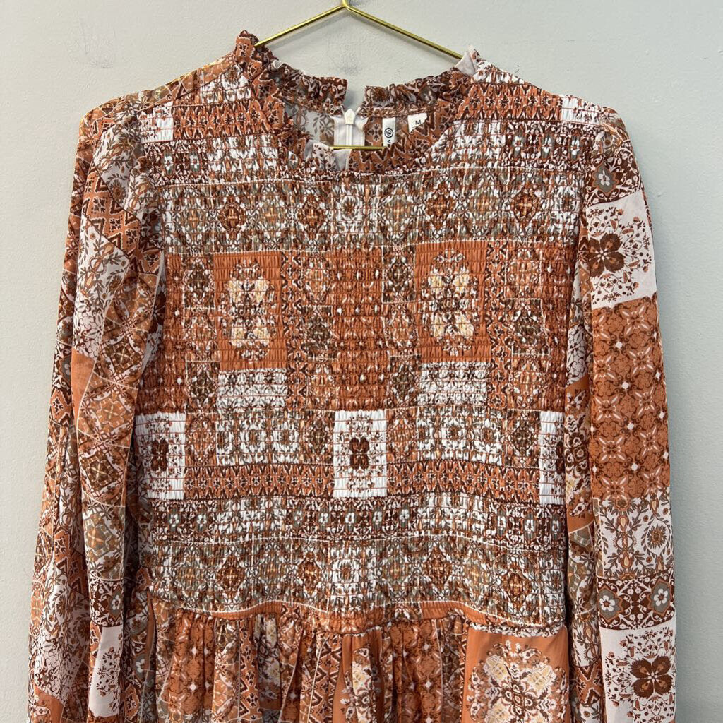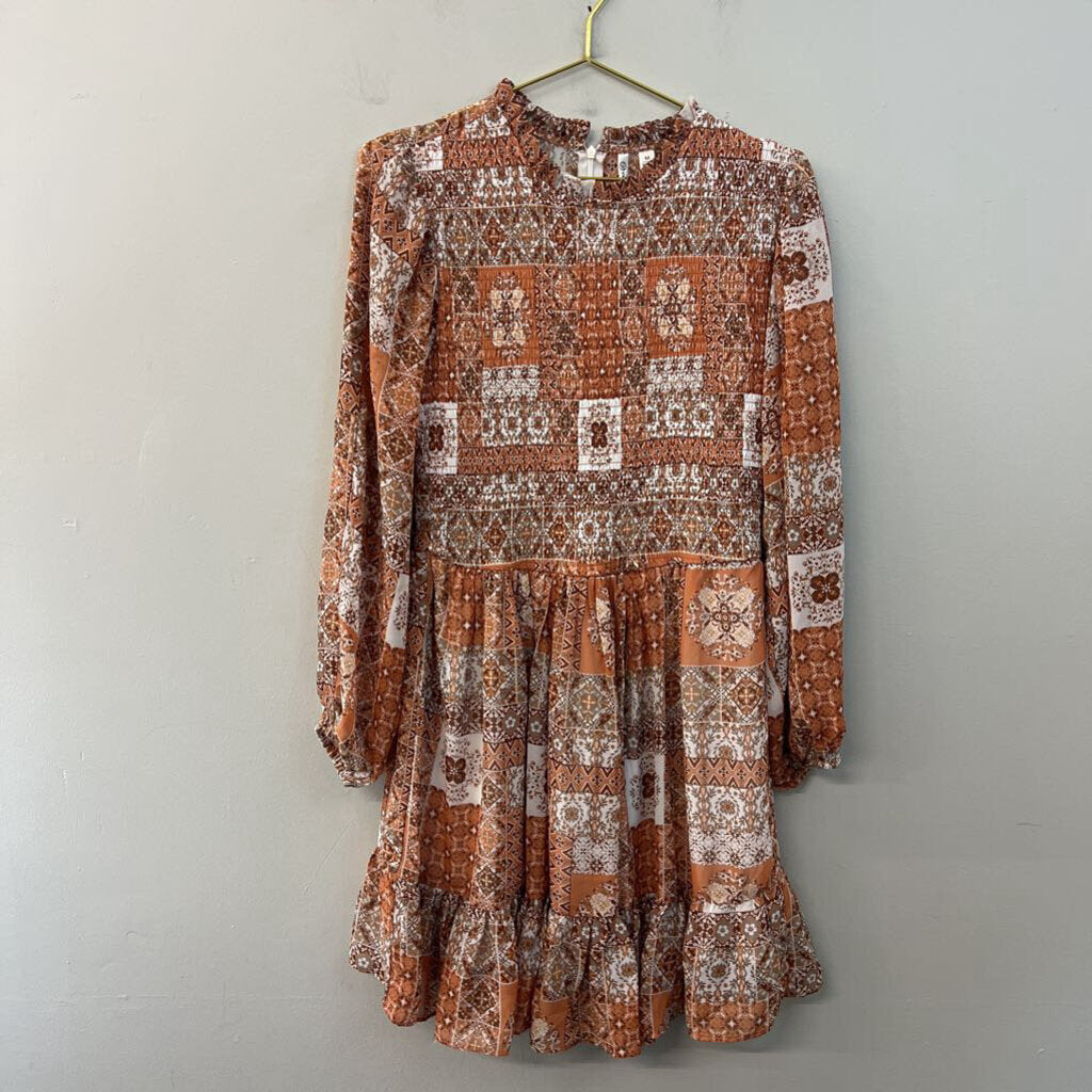 Orange/ Multi Print Long Sleeve Smocked Top Dress Medium