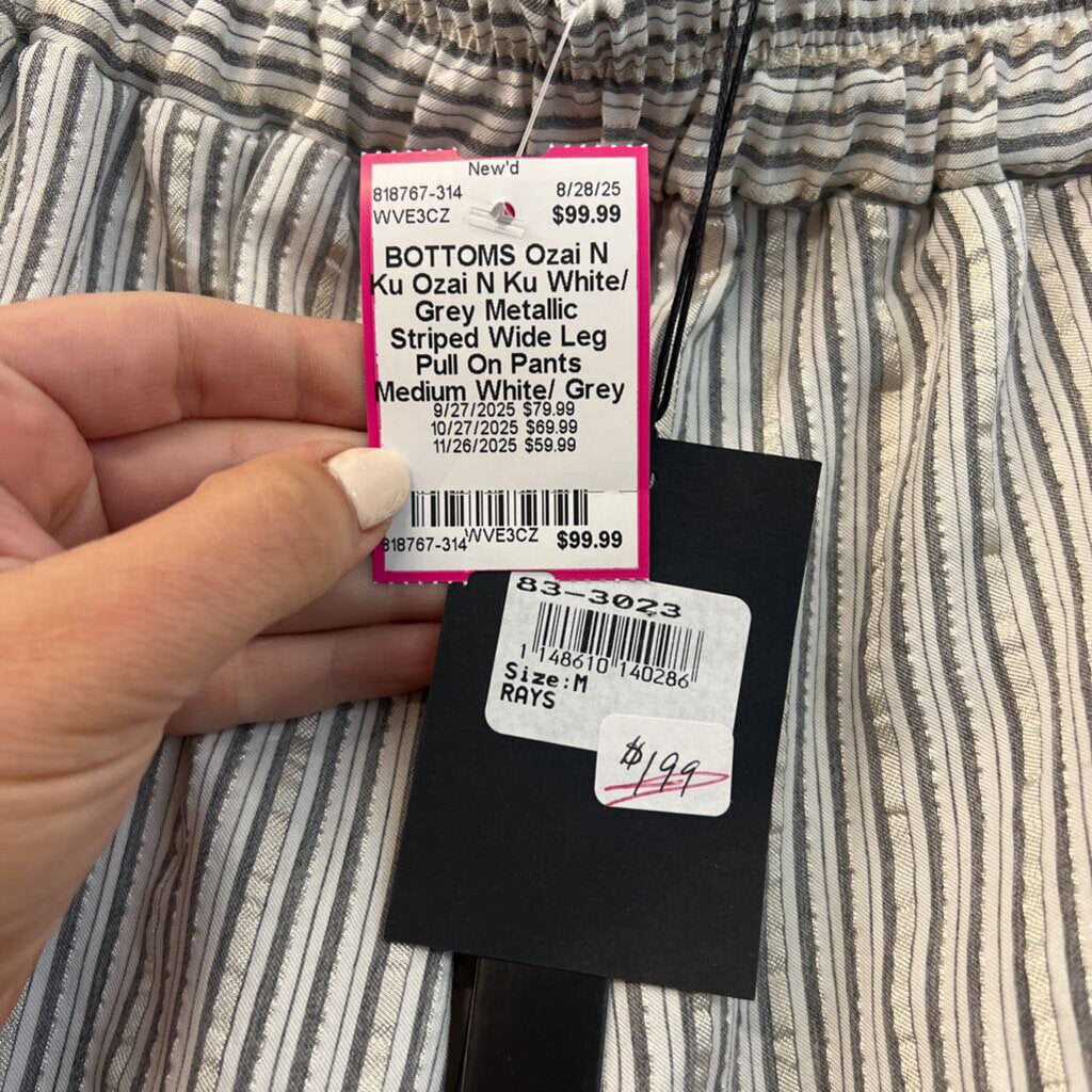 Ozai N Ku White/ Grey Metallic Striped Wide Leg Pull On Pants Medium