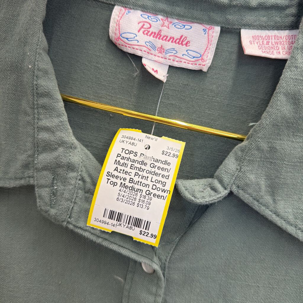 Panhandle Green/ Multi Embroidered Aztec Print Long Sleeve Button Down Top Medium