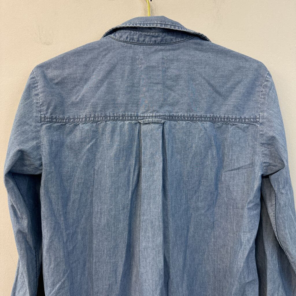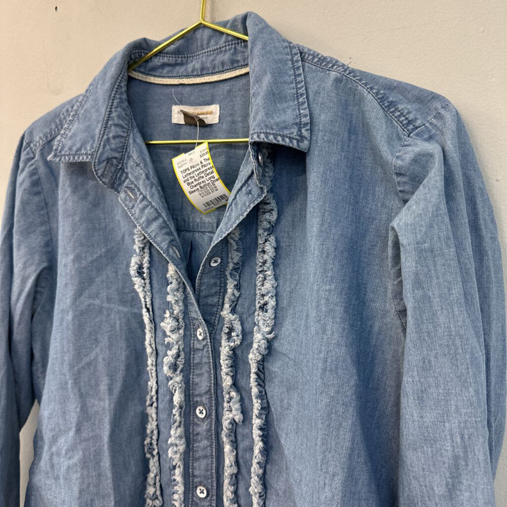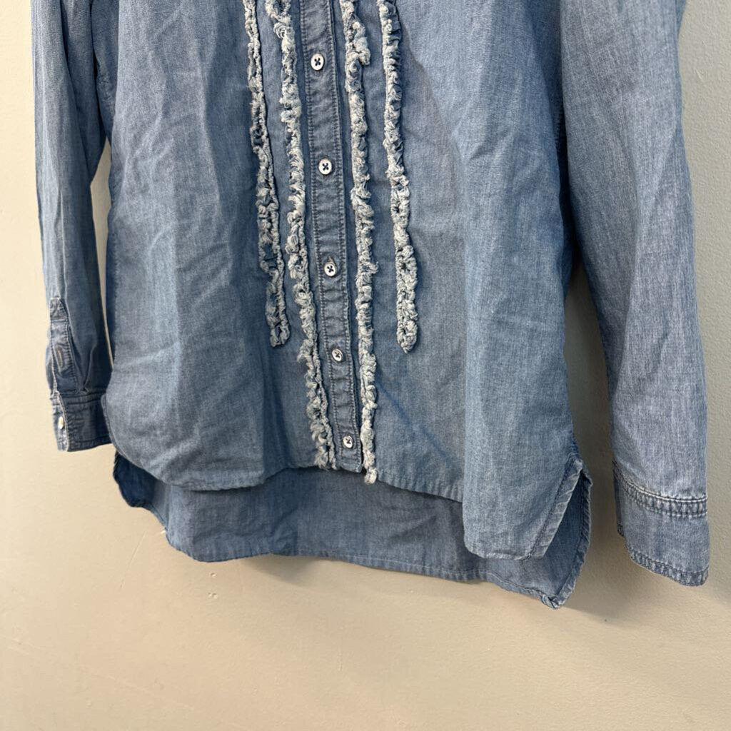 Pilcro and the Letterpress Blue Ruffle Detail Chambray Long Sleeve Button Down Top Small Anthropologie