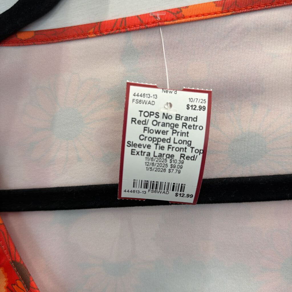 Red/ Orange Retro Flower Print Cropped Long Sleeve Tie Front Top Extra Large