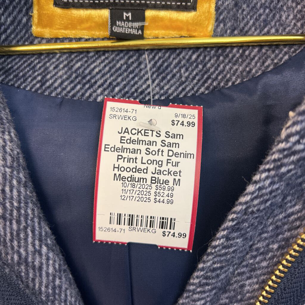 Sam Edelman Soft Denim Print Long Fur Hooded Jacket Medium