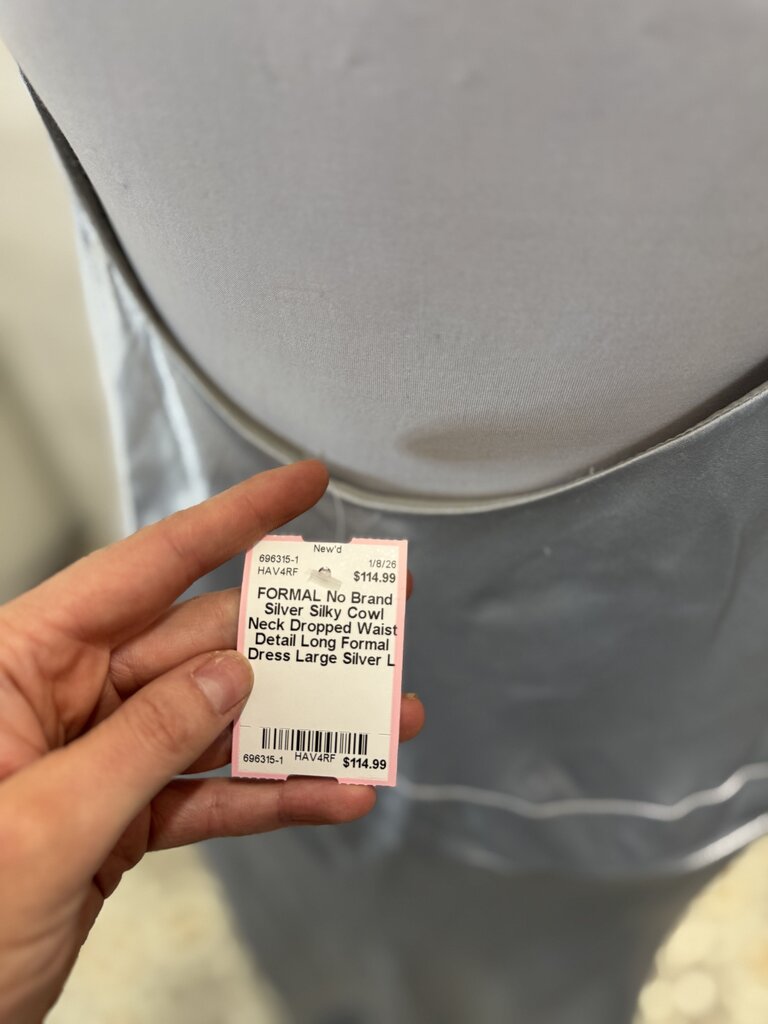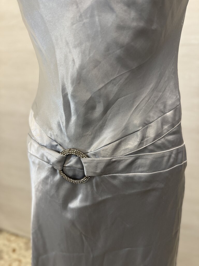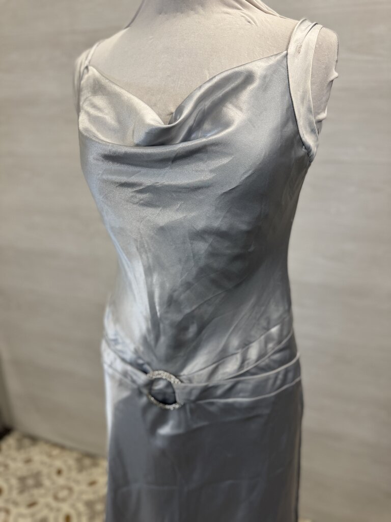 Silver Silky Cowl Neck Dropped Waist Detail Long Formal Dress Large