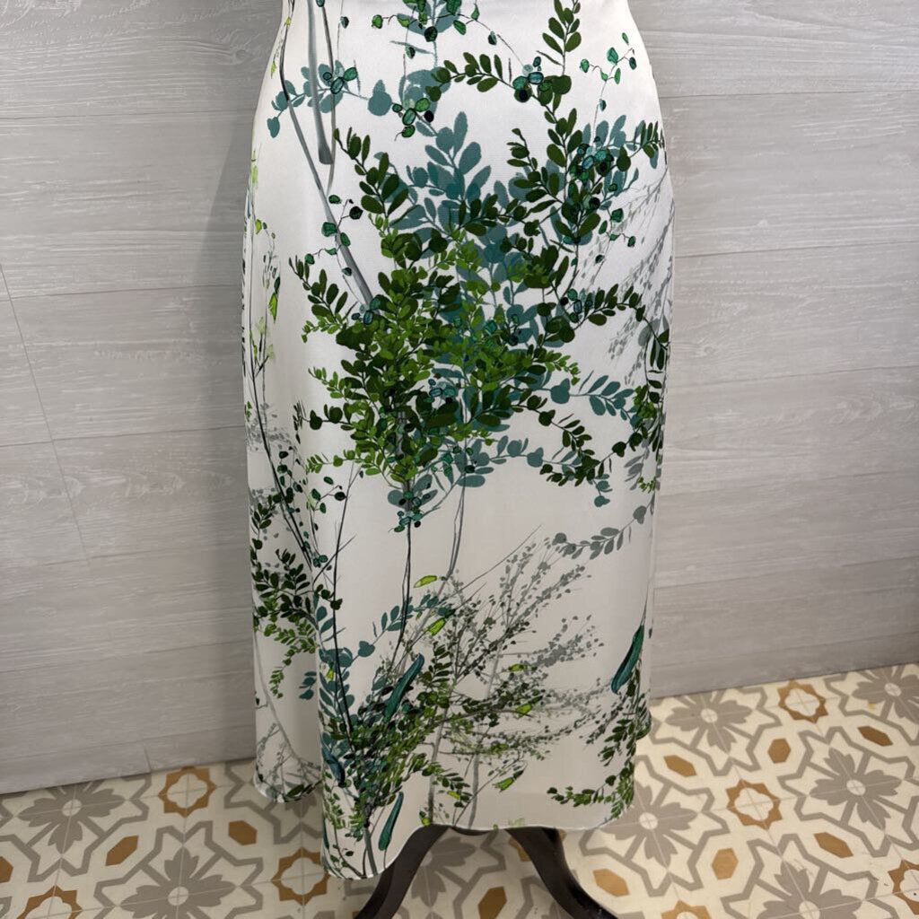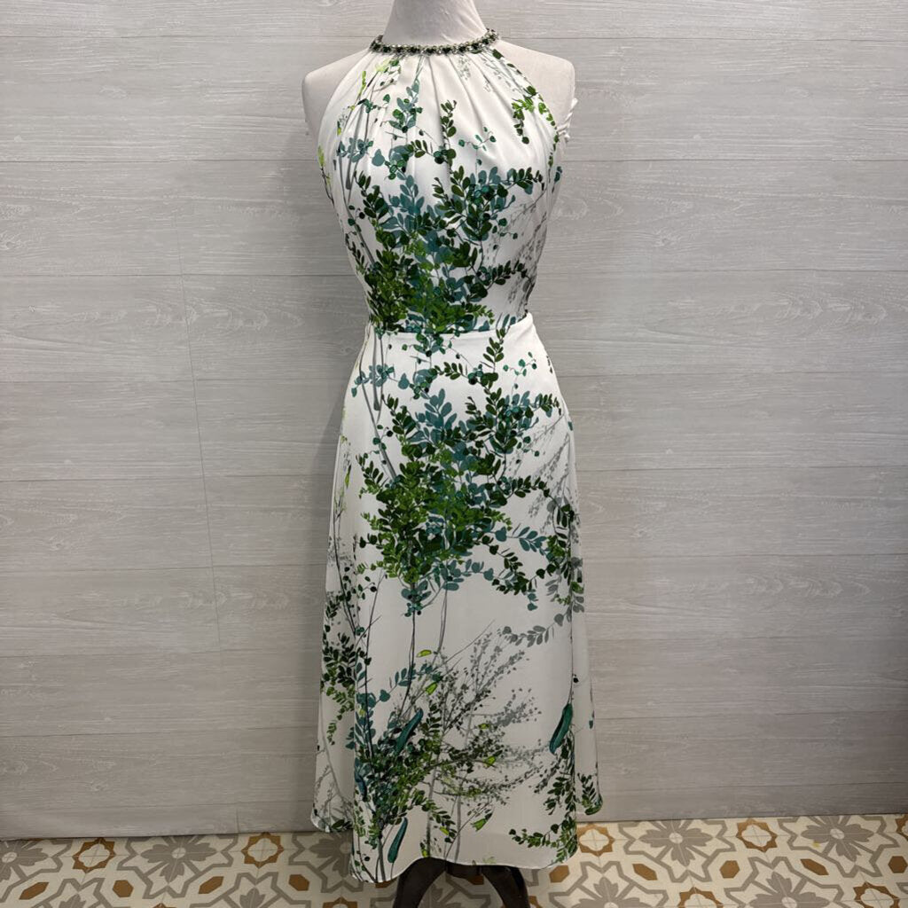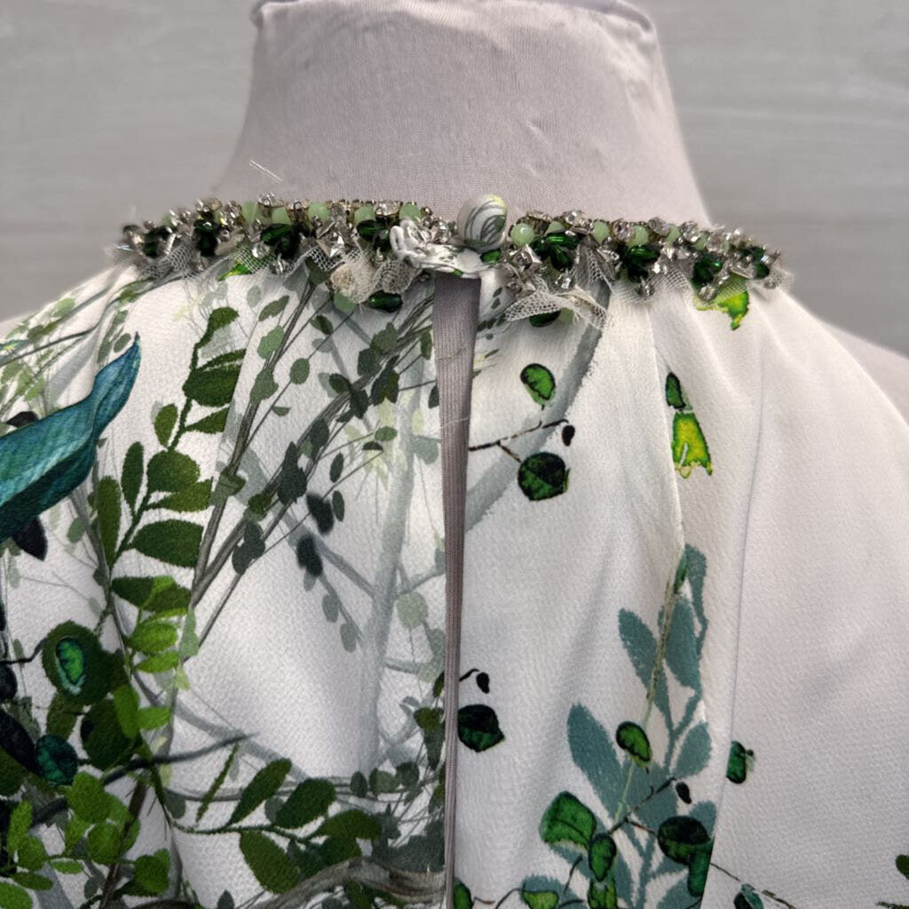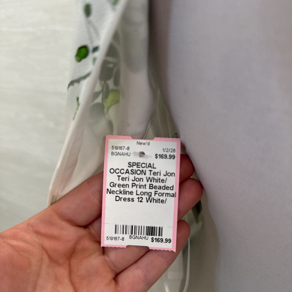 Teri Jon White/ Green Print Beaded Neckline Long Formal Dress 12
