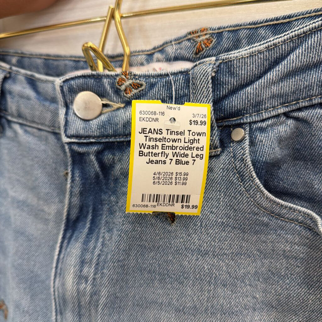 Tinseltown Light Wash Embroidered Butterfly Wide Leg Jeans 7