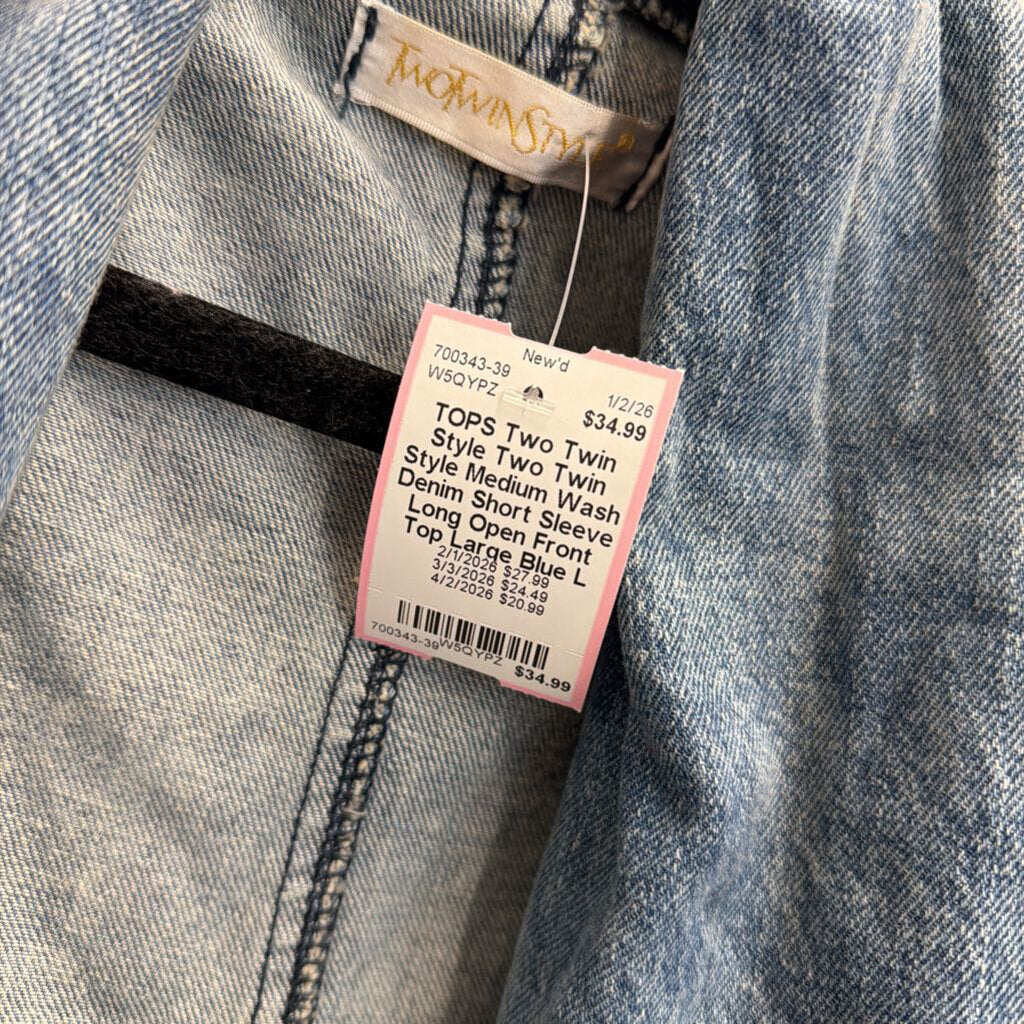 Two Twin Style Medium Wash Denim Short Sleeve Long Open Front Top Large