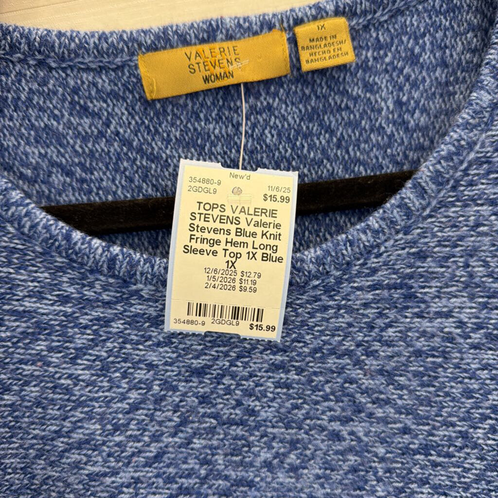 Valerie Stevens Blue Knit Fringe Hem Long Sleeve Top 1X