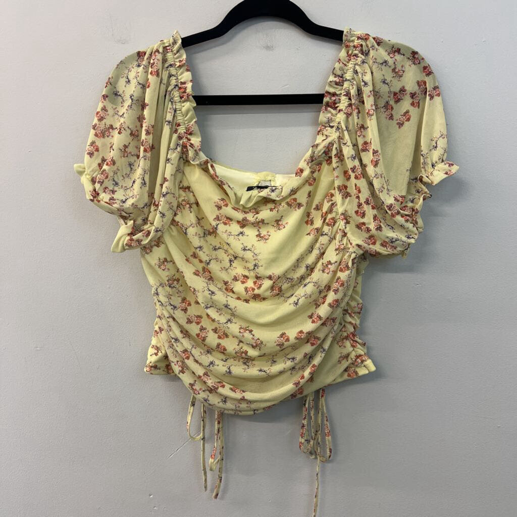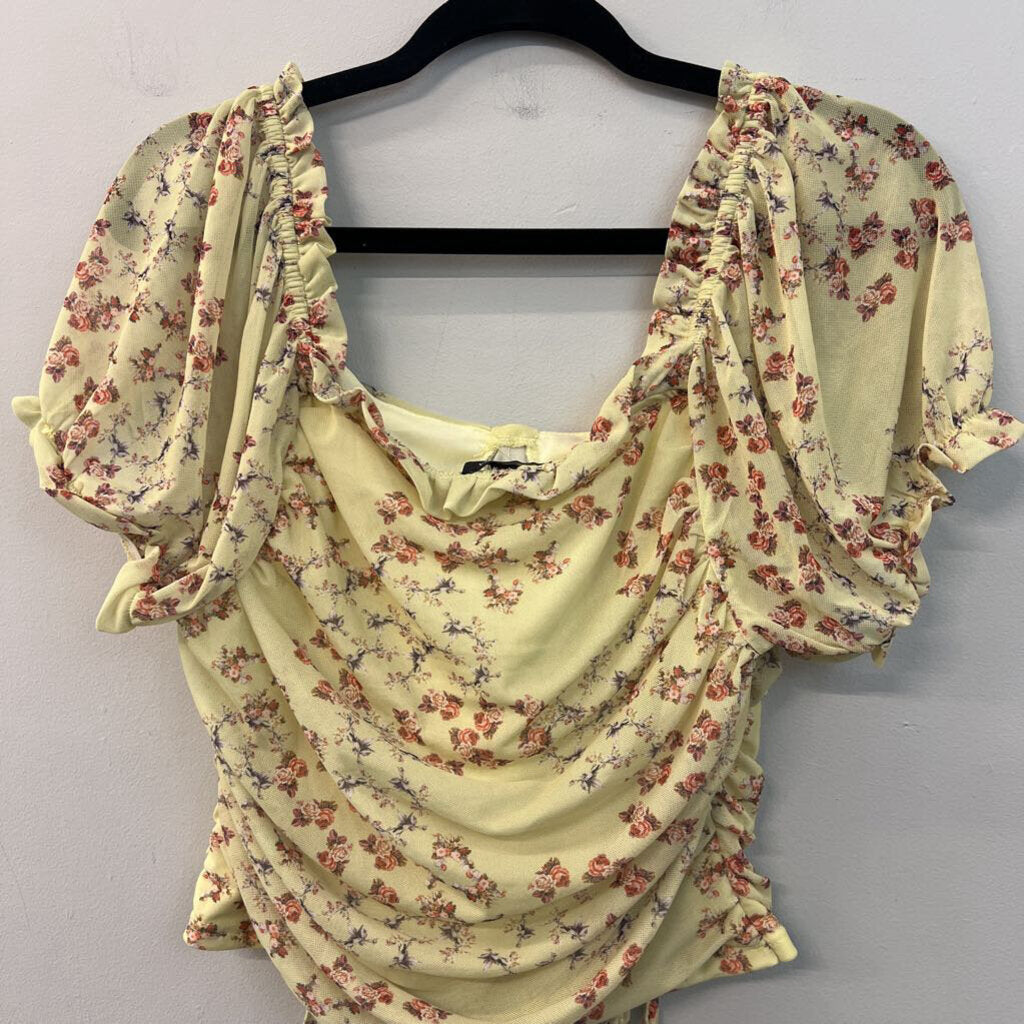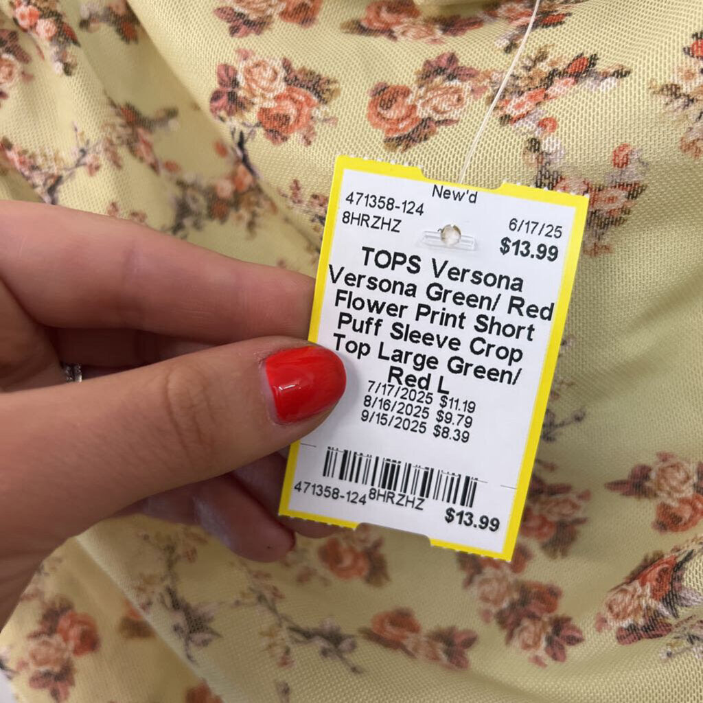 Versona Green/ Red Flower Print Short Puff Sleeve Crop Top Large