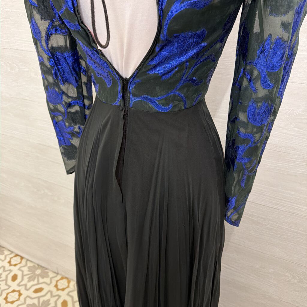 Vintage Black/ Metallic Blue Print Long Sleeve Top Chiffon Skirt Long Formal Dress Small