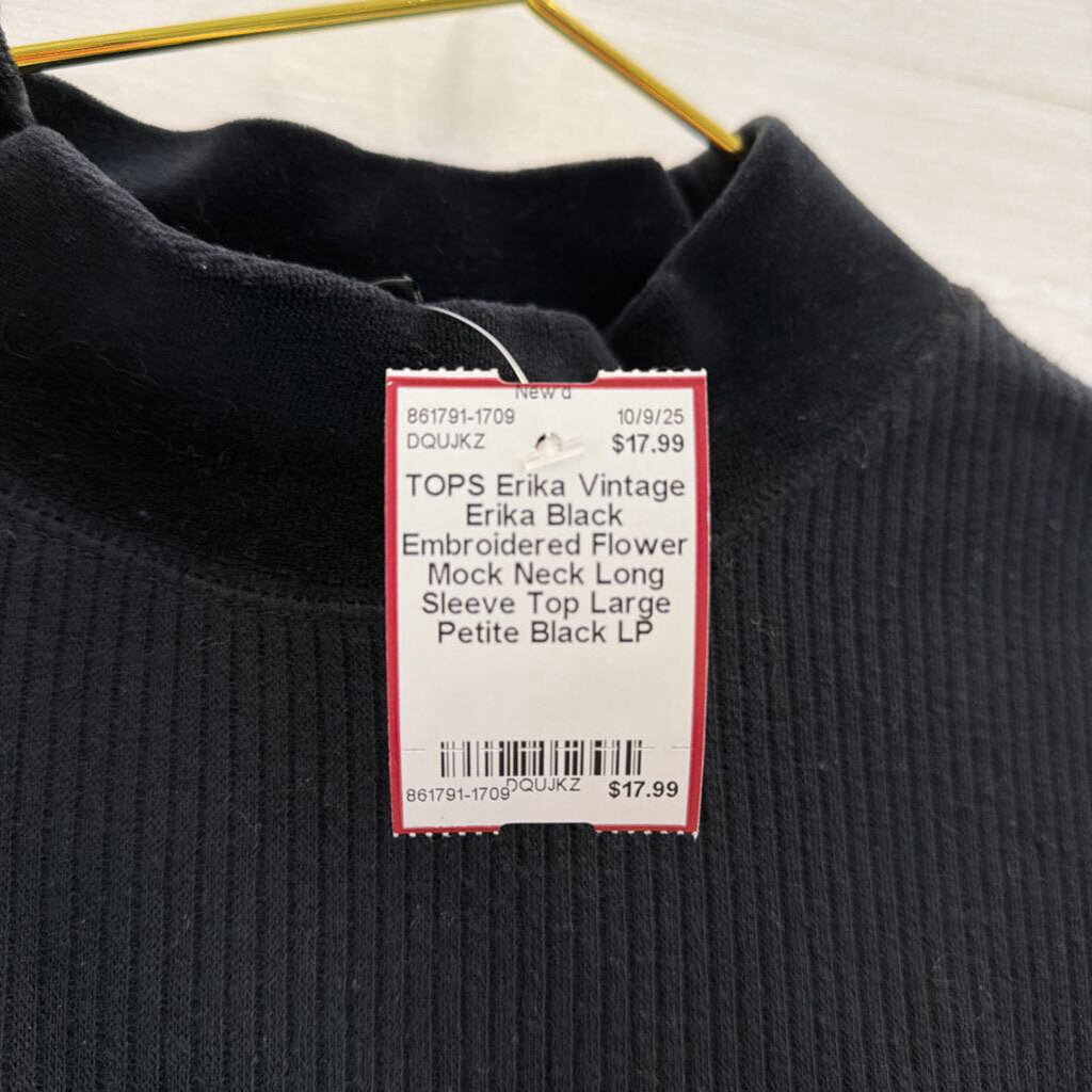 Vintage Erika Black Embroidered Flower Mock Neck Long Sleeve Top Large Petite