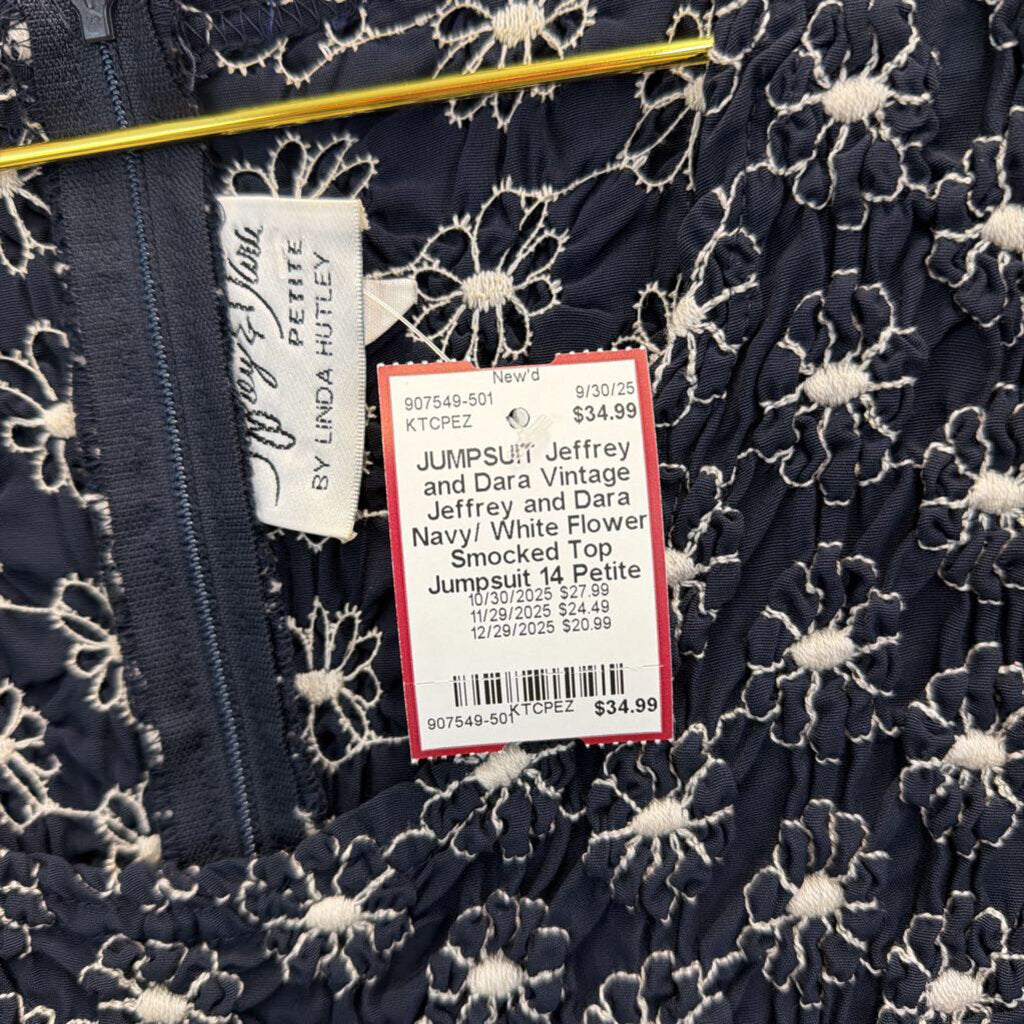 Vintage Jeffrey and Dara Navy/ White Flower Smocked Top Jumpsuit 14 Petite