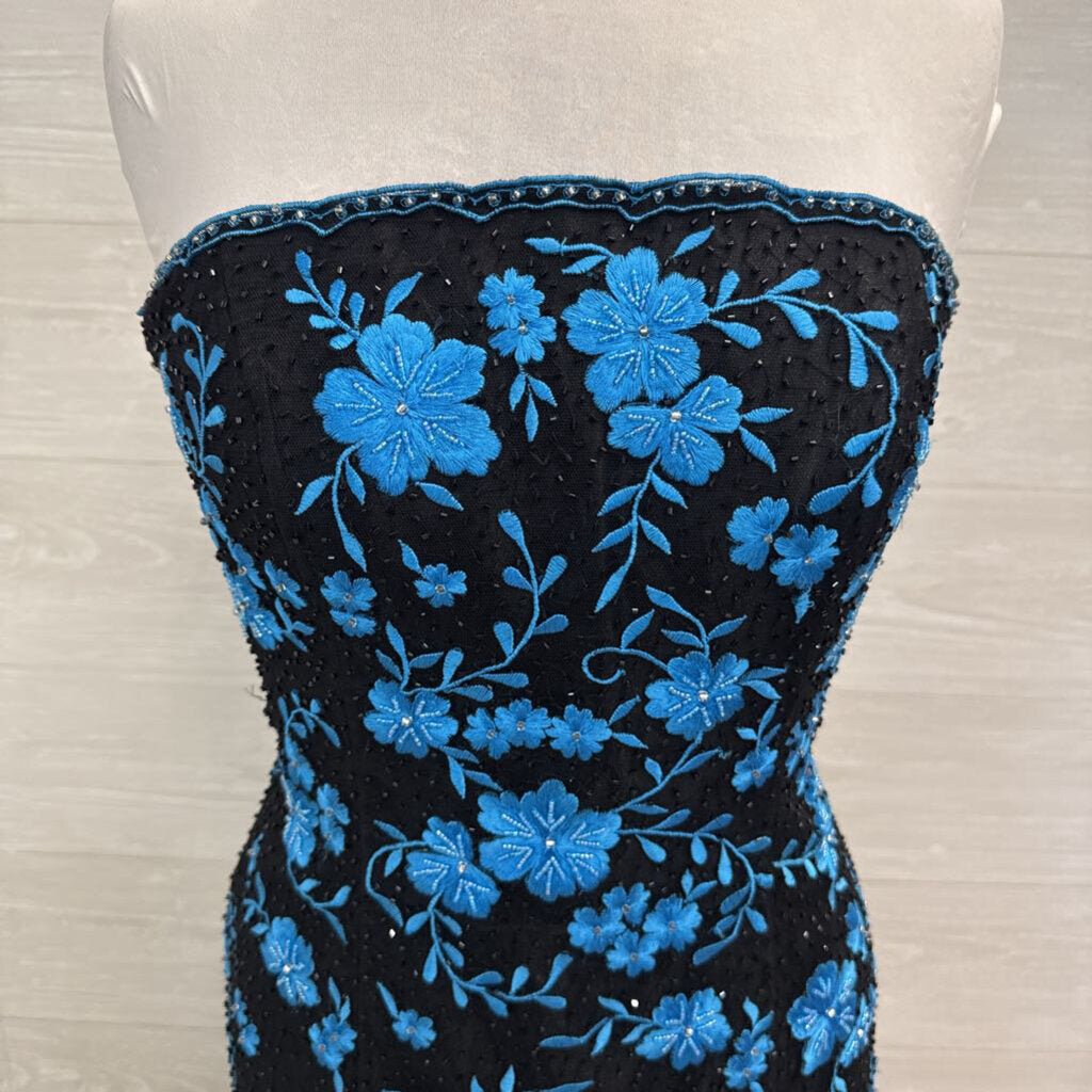 Vintage Jovani Black/ Blue Floral Embroidered/ Beaded Strapless Long Formal Dress 8