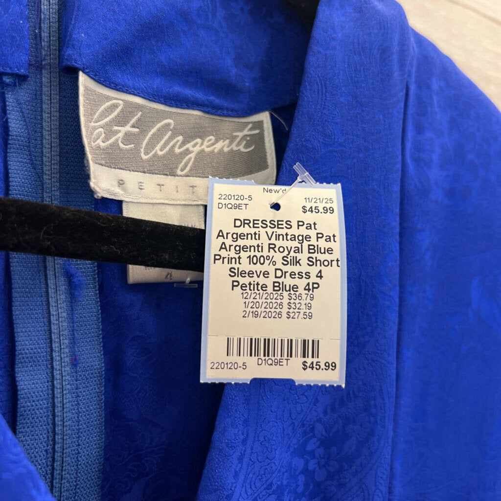Vintage Pat Argenti Royal Blue Print 100% Silk Short Sleeve Dress 4 Petite