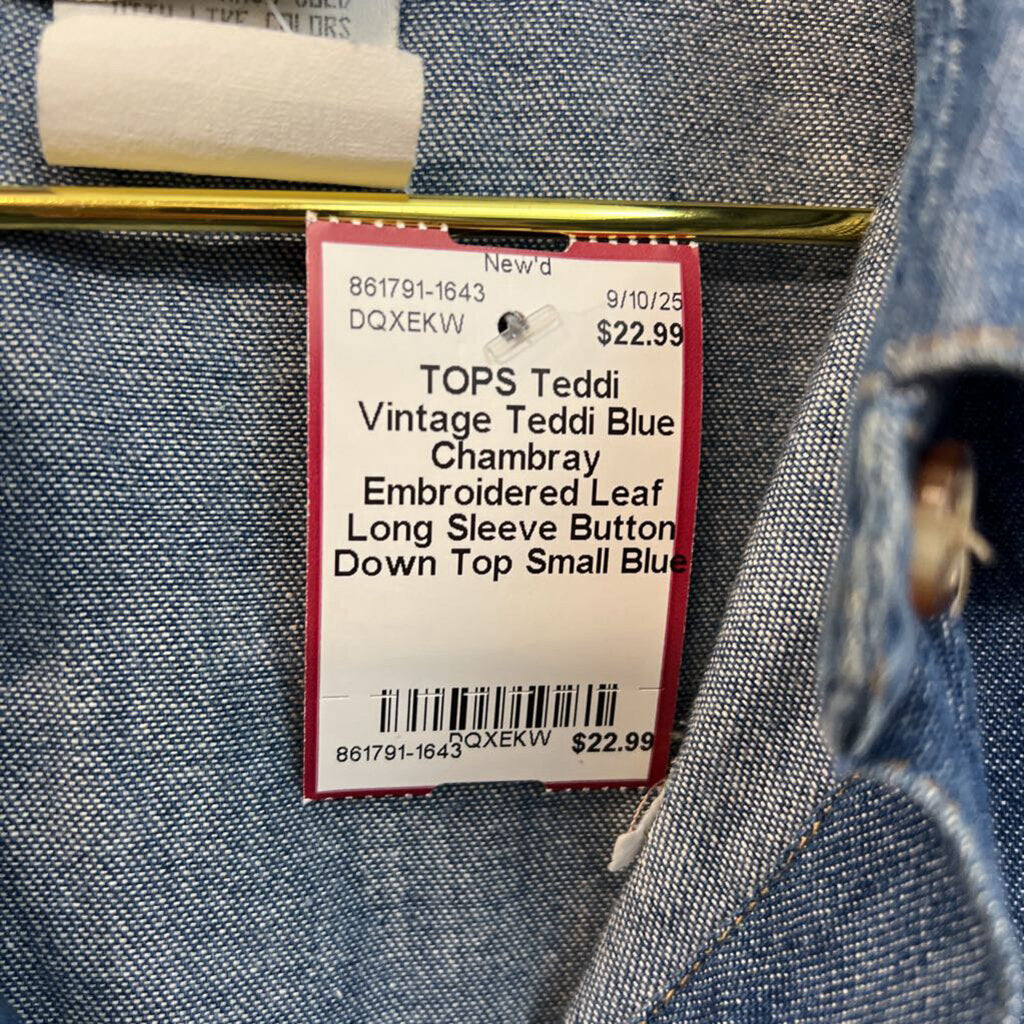 Vintage Teddi Blue Chambray Embroidered Leaf Long Sleeve Button Down Top Small