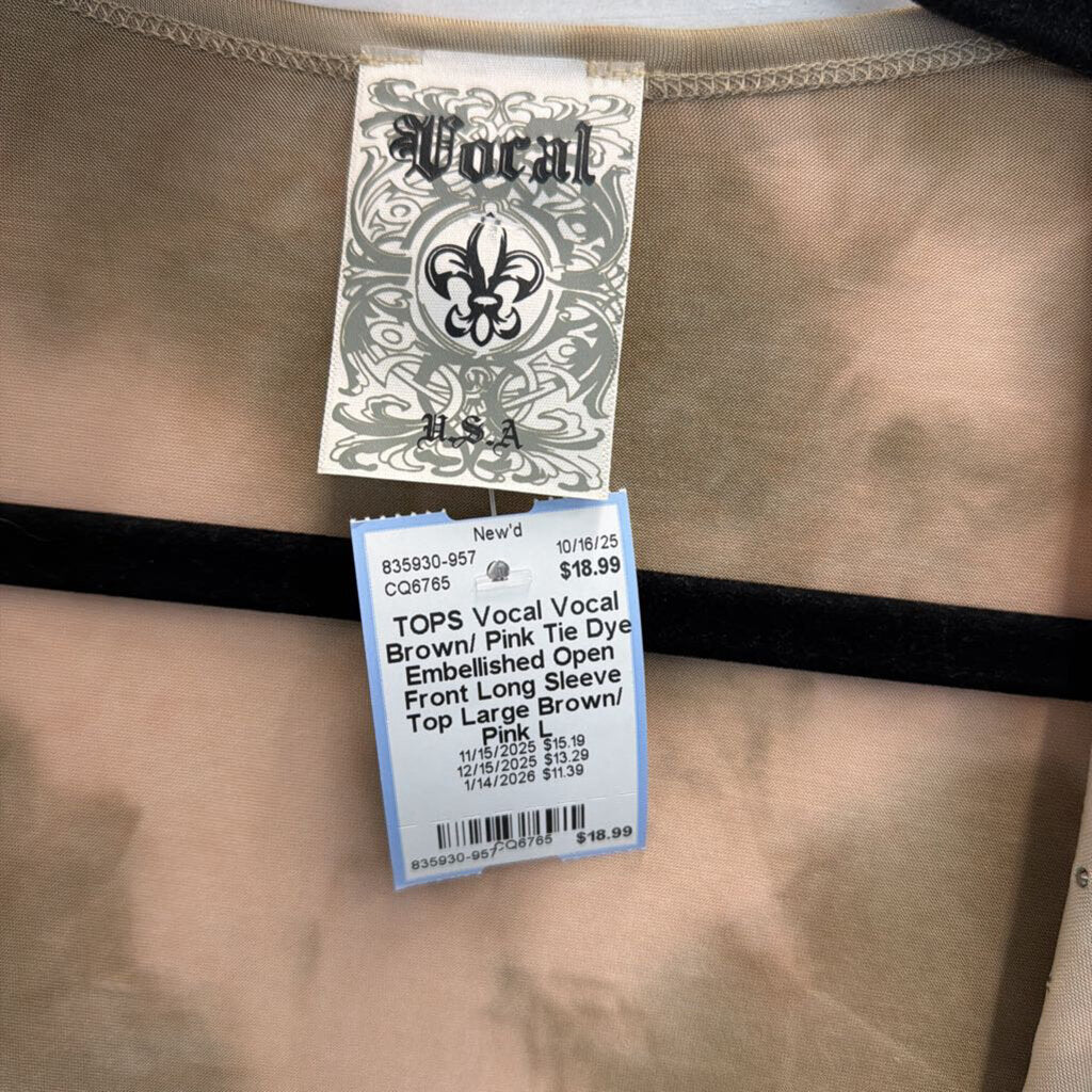 Vocal Brown/ Pink Tie Dye Embellished Open Front Long Sleeve Top Large