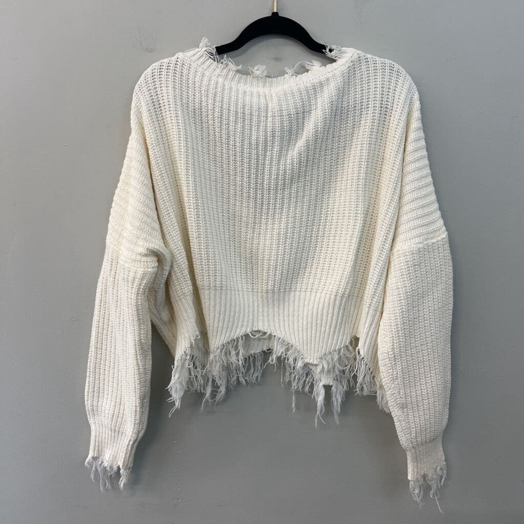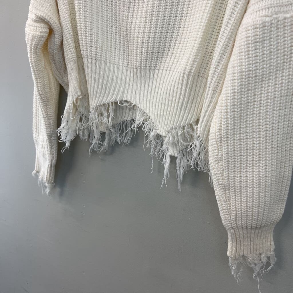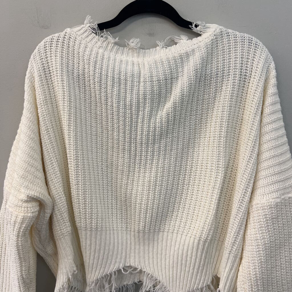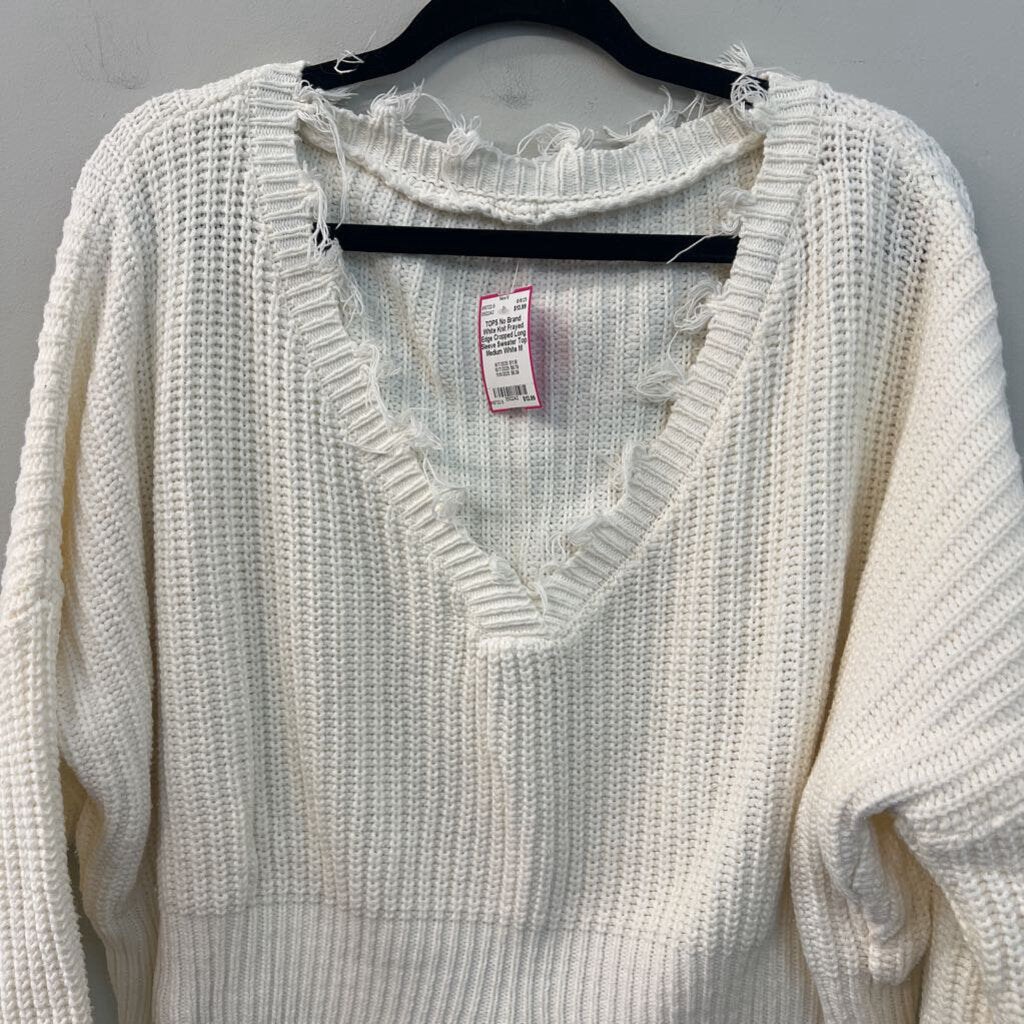 White Knit Frayed Edge Cropped Long Sleeve Sweater Top Medium