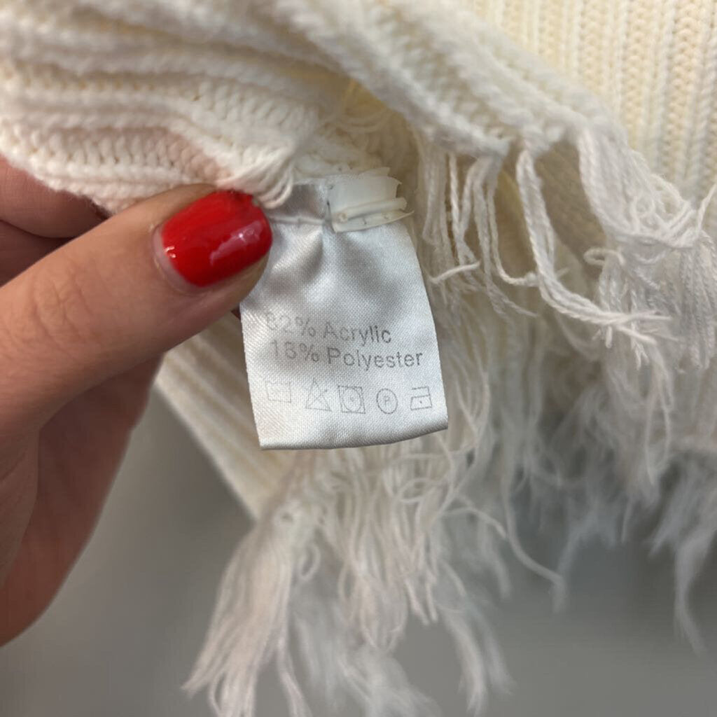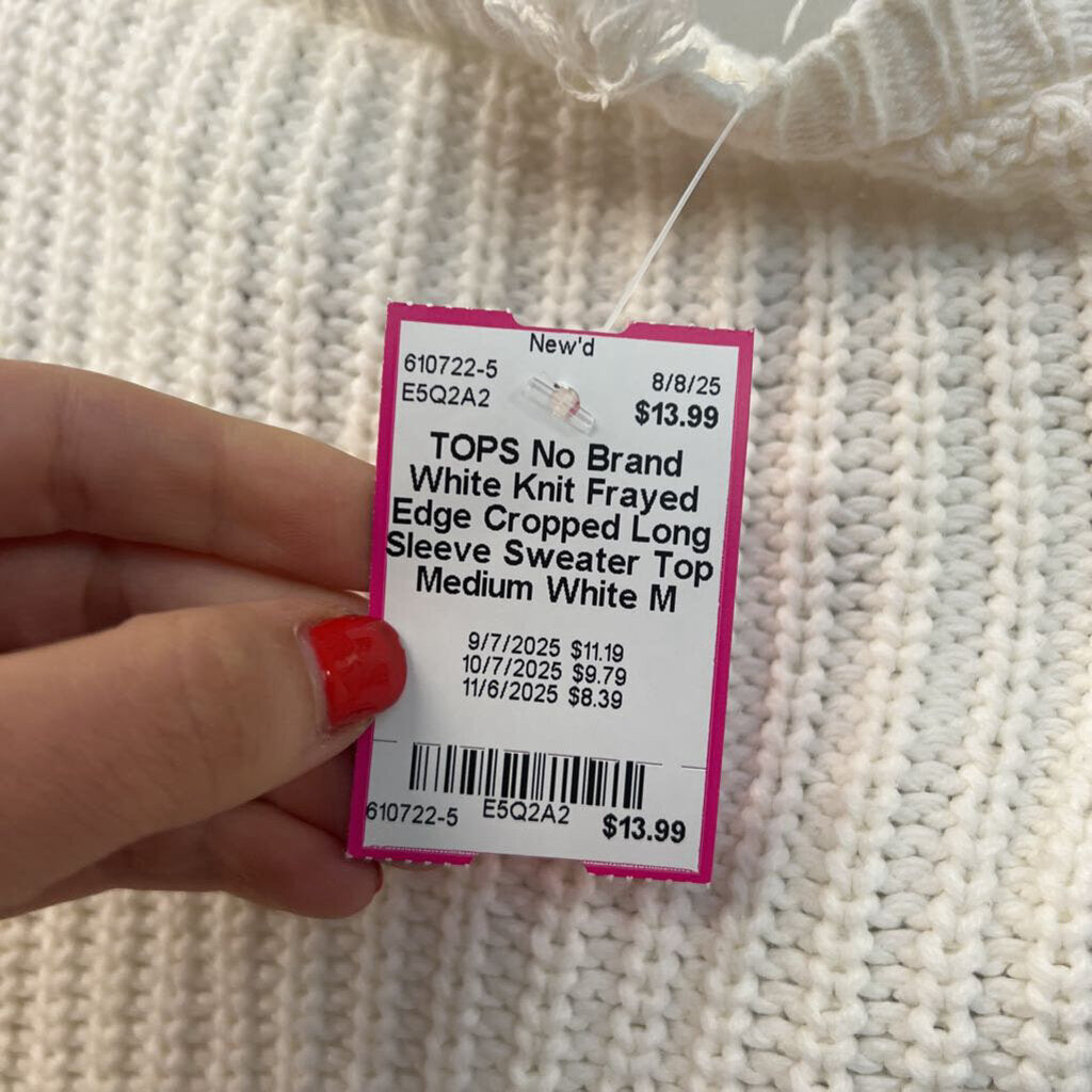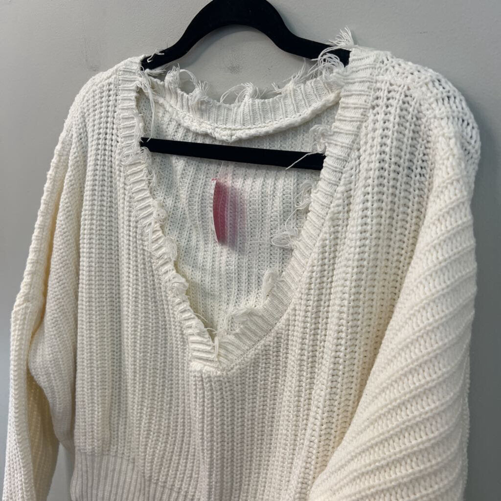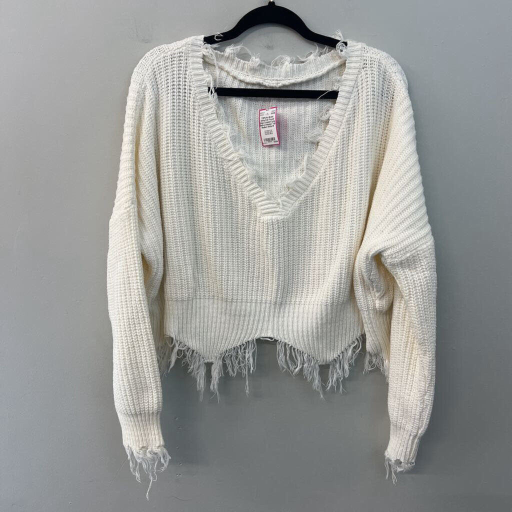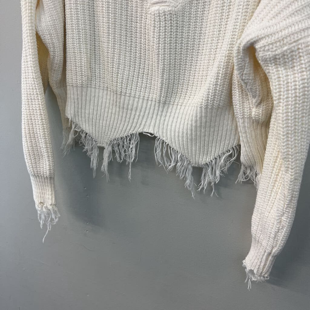 White Knit Frayed Edge Cropped Long Sleeve Sweater Top Medium